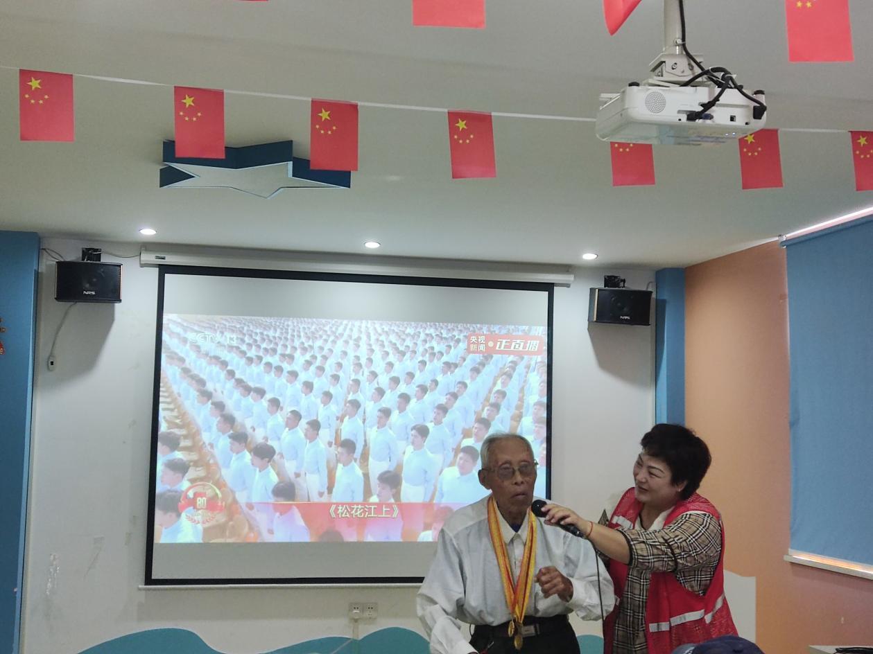 111社区96岁抗战老兵张银忠,身着白衬衣、脖子上挂着勋章隆重出席,在国歌奏响时奋力将微弯身躯挺直,双眼凝视国旗,满是历经沧桑的坚定与自豪。