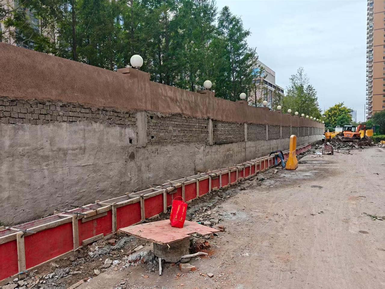 随后,记者来到小区物业了解情况,一位工作人员介绍,正在修建的围墙属于小区自有围墙,且位于小区红线范围内。之所以重修,是因为原来的围墙出现了炸裂情况,存在安全隐患,因此拆除旧墙后重新修建。