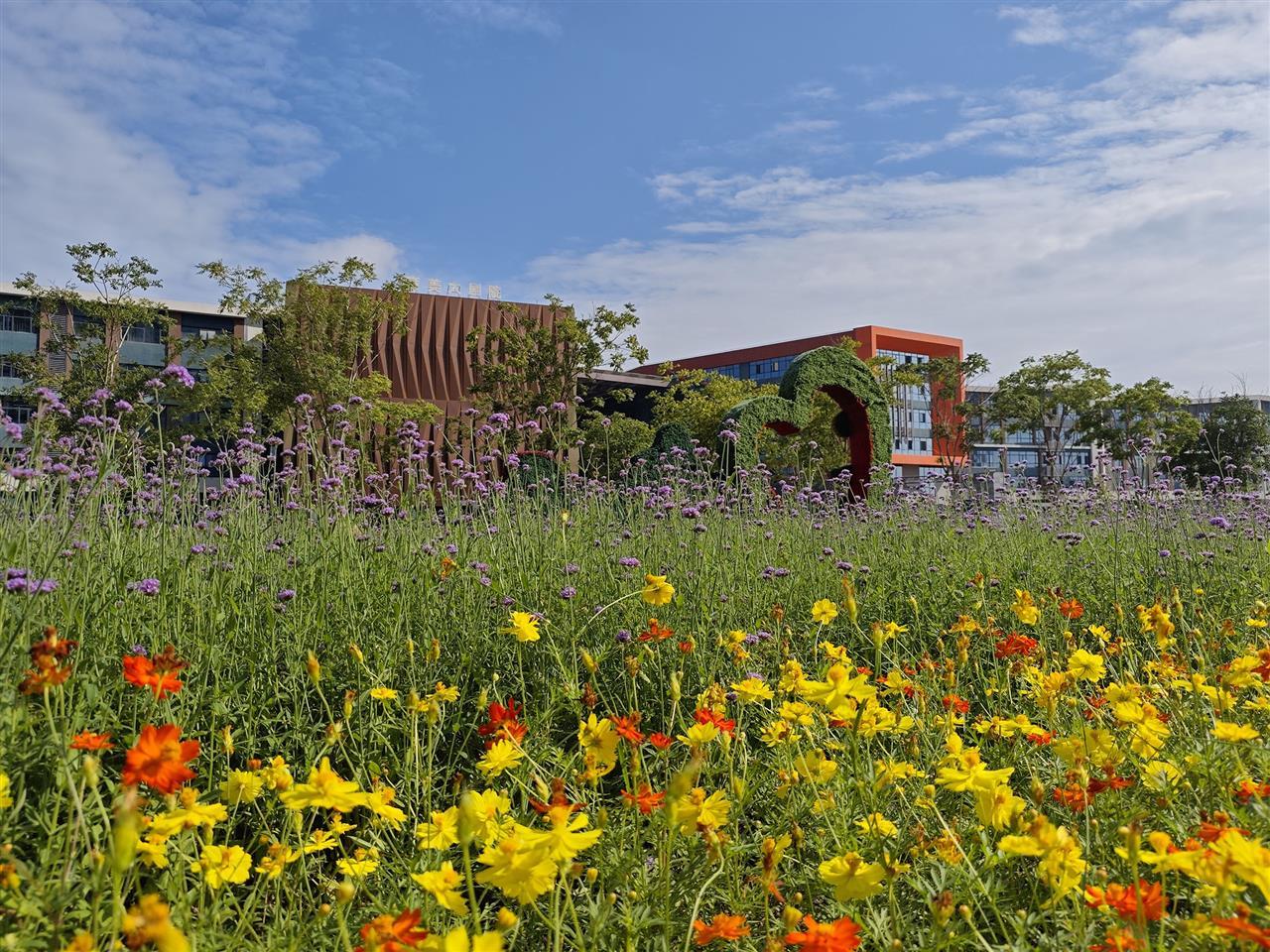 来到育才美术高中对面,只见18.8万株马鞭草以“大片块状”集中种植,形成铺天盖地的“紫色云霞”,成为花海的视觉核心;15公斤硫华菊种子播撒在花海边缘及步道两侧,化作“橙黄丝带”,勾勒出花海的灵动轮廓。沿育才美术高中外墙漫步,3.4万株墨西哥鼠尾草舒枝展叶,蓝紫色花穗形成高低错落的“立体花境”;5000株月季则点缀在外围,丰富花色延长观赏周期。