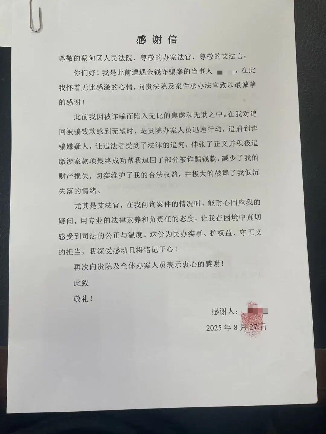 案件审结后,王某某在感谢信中写道,自己“感受到司法的公正与温度”,并对法官司法为民的情怀深表敬意。