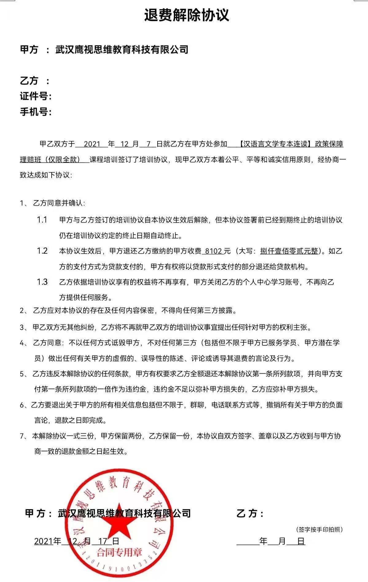 经过多轮沟通协商,2021年12月17日,曹女士与武汉鹰视思维教育科技有限公司签订退费解除协议,双方正式解除合同,公司扣除相关费用后退还曹女士8102元学费。然而,这达成一致的退款协议,却成了曹女士近四年来的“心病”——从合同解除当天起,她便开始等待退款到账,可左等右等始终没有消息。