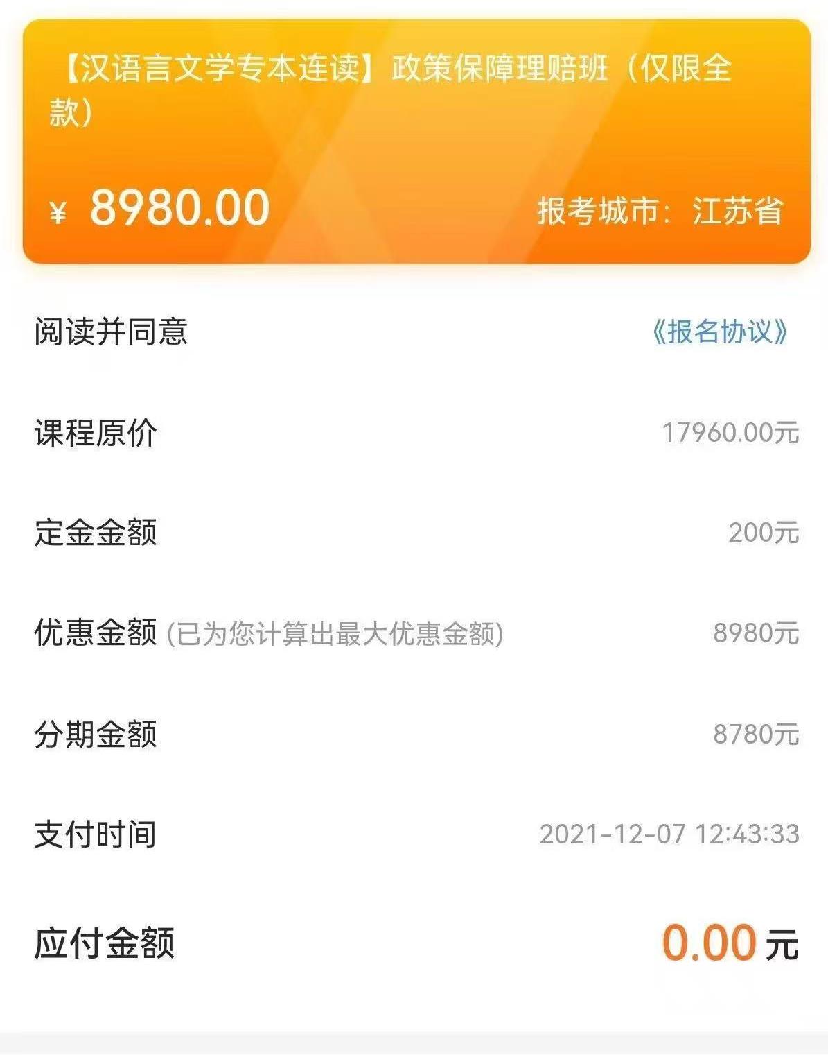 2021年12月7日,曹女士为提升学历,在网上找到武汉鹰视思维教育科技有限公司(现更名为 “武汉易教思维在线科技有限公司”)报名汉语言文学专本连读的成教网络课程,并一次性缴纳了8980元学费。可当天报完名,曹女士就接到工作岗位调整的通知,日常工作强度大幅增加,根本无法抽出时间按时参与线上课程学习。考虑到课程长期闲置会造成浪费,曹女士在与家人商量后,向该教育机构提出退课申请。