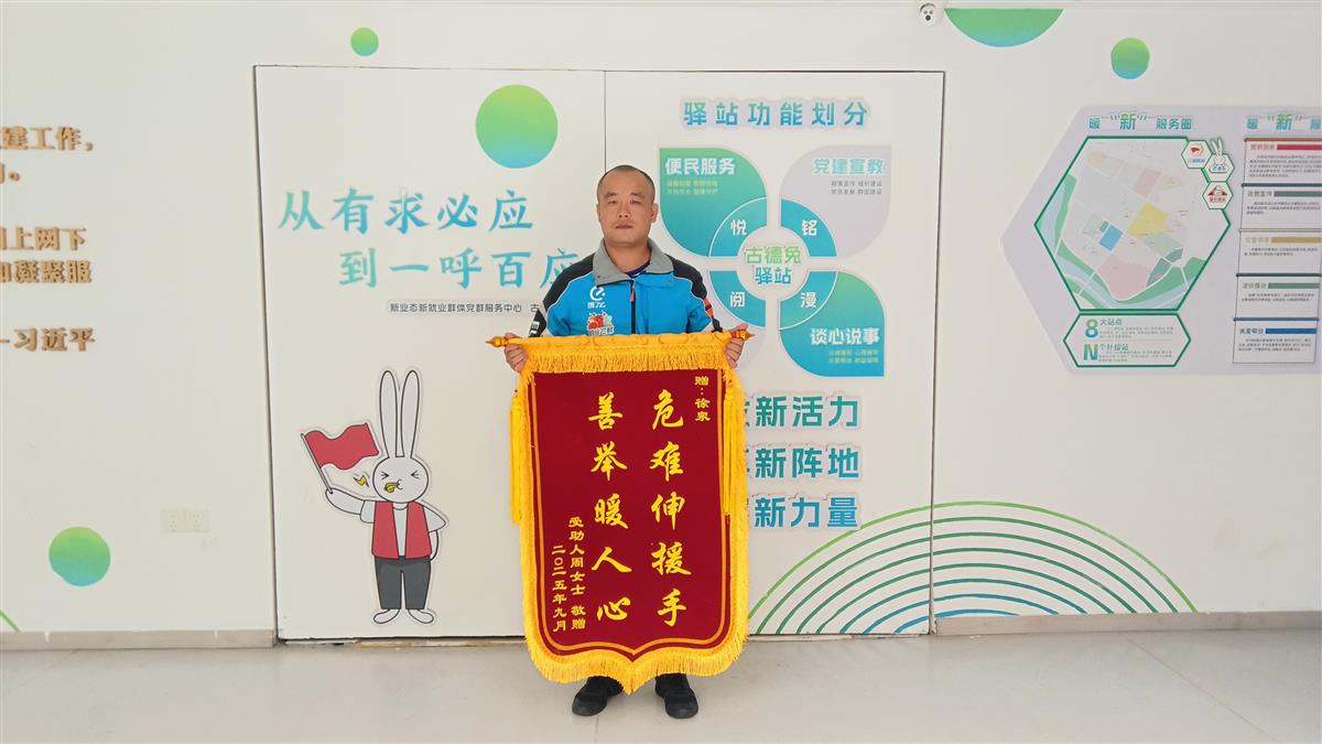 当月,一面印有“危难伸援手 善举暖人心”的锦旗被送至古德兔户外工作者驿站。周女士母亲表示:“当时女儿受伤,加上情绪也不稳定,若非骑手徐泉及时相助,后果不堪设想。他不仅救了人,更让我们感受到外卖骑手群体的善意。”面对赞誉,徐泉表示:“我只是做了该做的事。平时驿站常组织急救培训,站点及社区也提醒我们‘送餐路上注意安全’,现在能帮到别人,也是欣慰。”