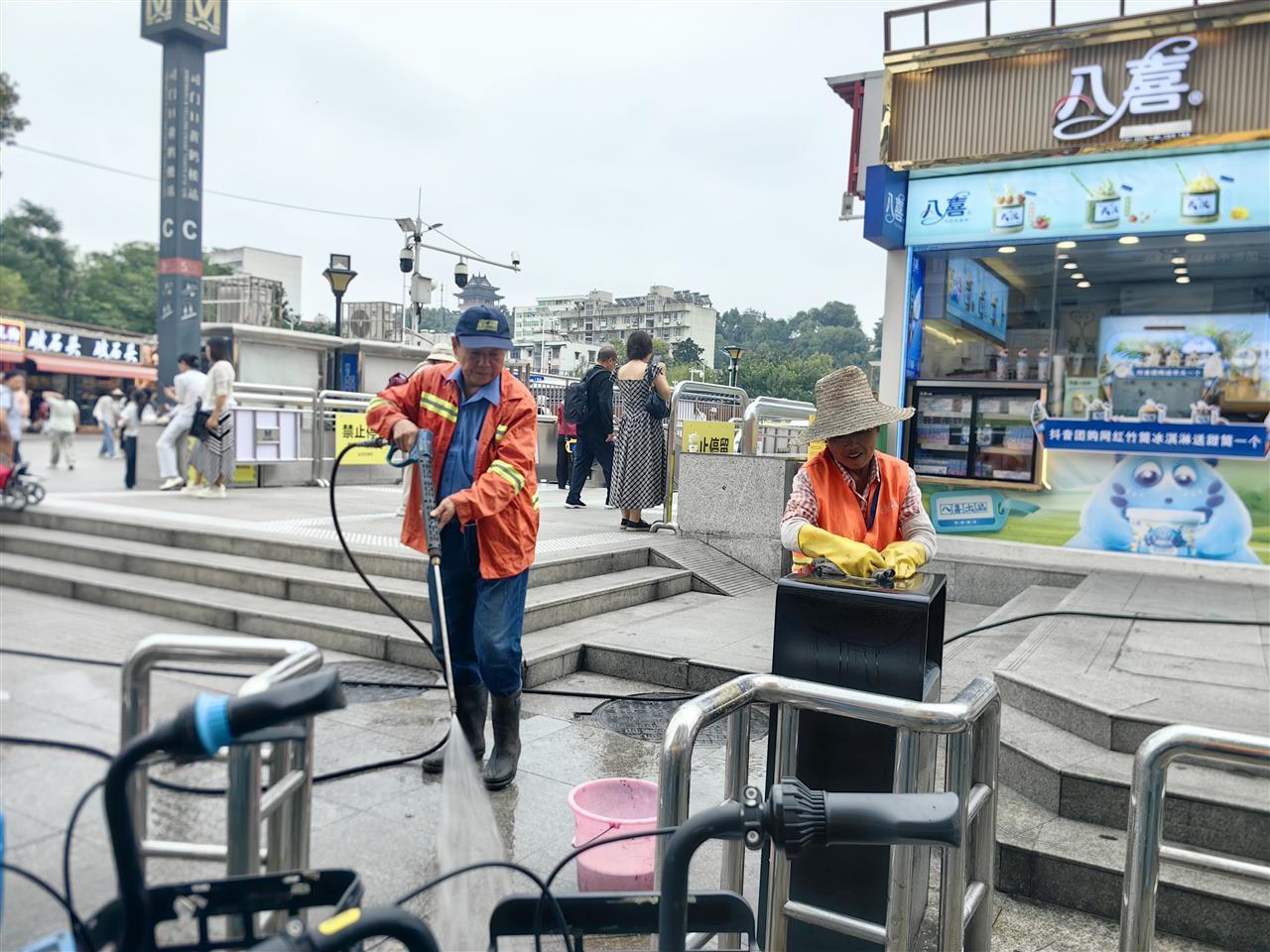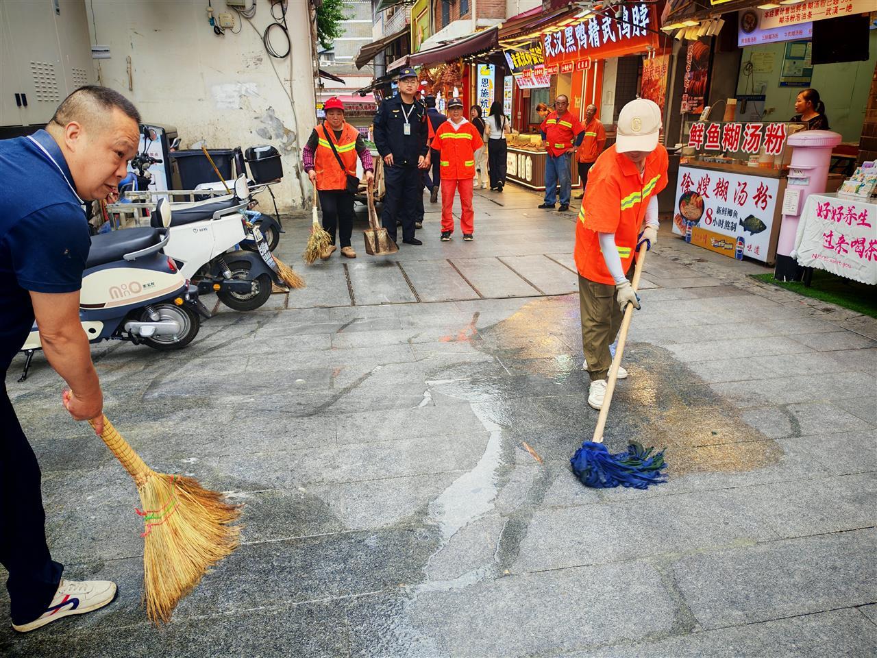 行动中,武汉天呈祥环卫工程有限公司的环卫工人们手持高压水枪、扫帚等工具,对户部巷美食街的路面油污、红墙周边的烟头和纸屑进行深度清理。