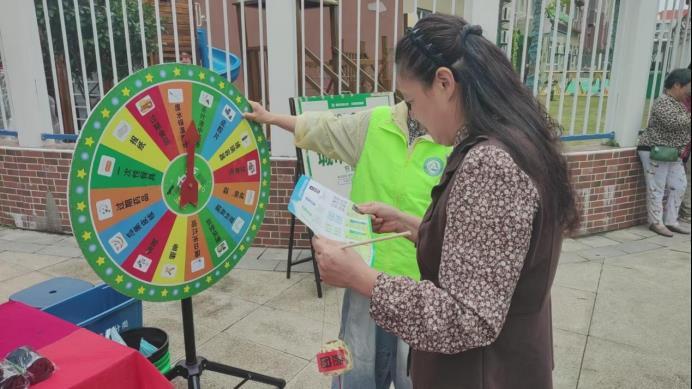 作为集市核心展区之一,武汉将军路市政环卫公司以“垃圾分类·益起行动”为主题,打造了沉浸式科普体验空间。“分类转转转”游戏中,设置多重垃圾分类,由居民转动转盘,指针指向哪种垃圾由居民回答属于哪一种垃圾。现场排起长队,家长王女士点赞:边玩边学,回家还可以教孩子垃圾怎么分!