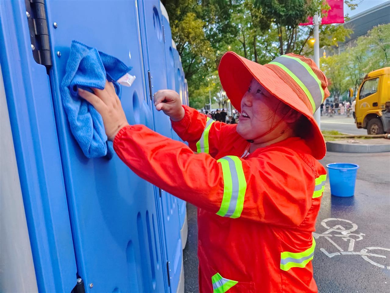 “厕纸要再补一些,地面得再拖一遍!”晚上7点,环卫工人王霞正蹲在移动公厕旁,仔细擦拭着地面的污渍。她负责的是体育中心北侧的10座移动公厕之一,从昨天开始,她就和同事们提前到场,检查公厕设施、调试冲水系统、储备手纸和清洁用品,为演唱会当天的大客流做足准备。