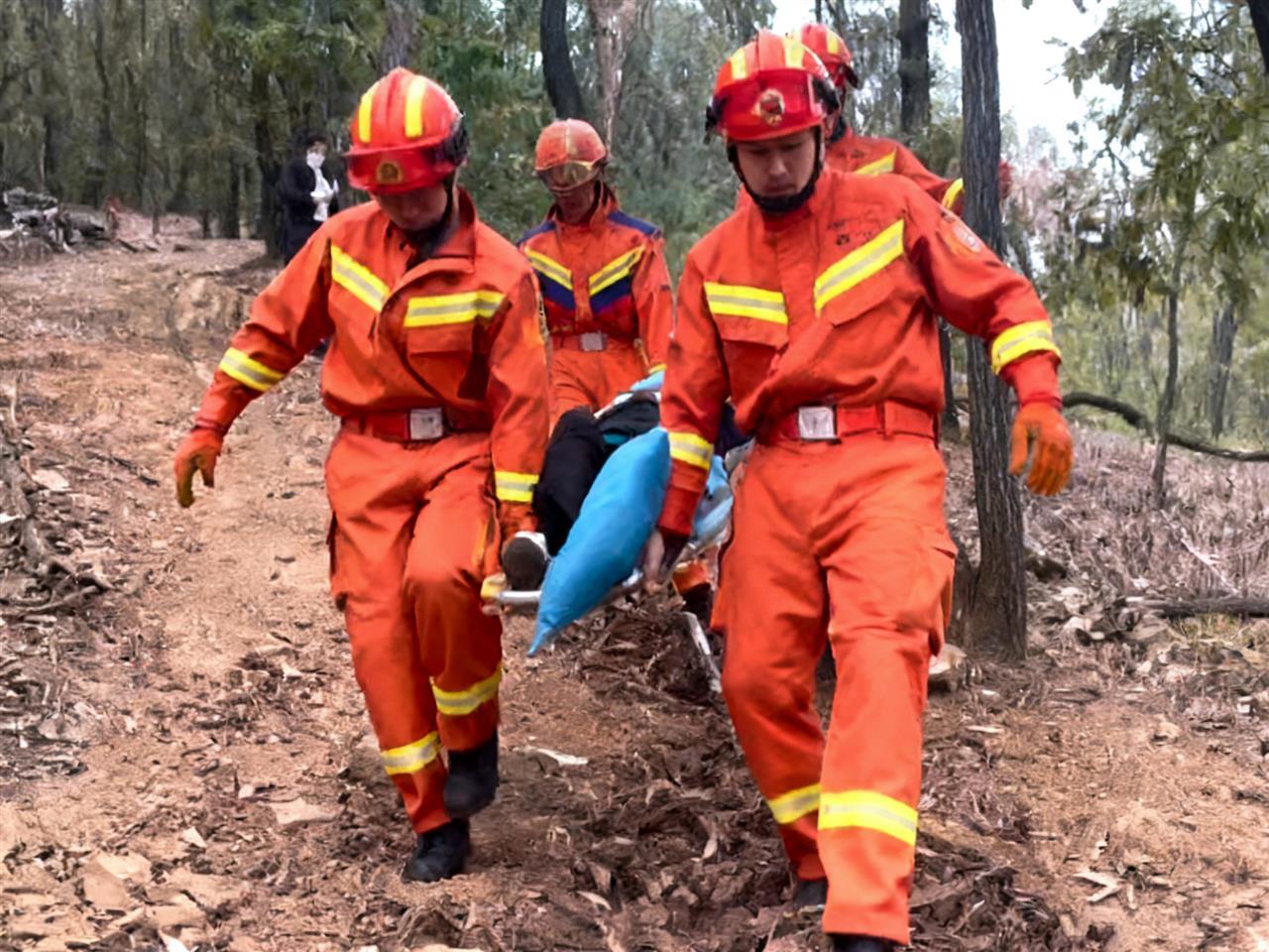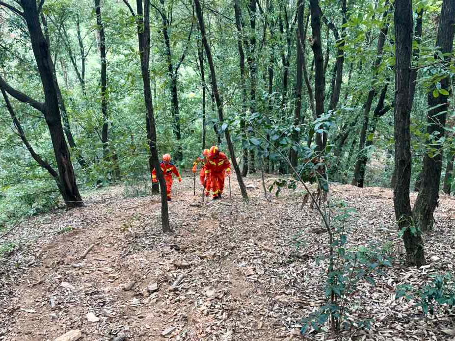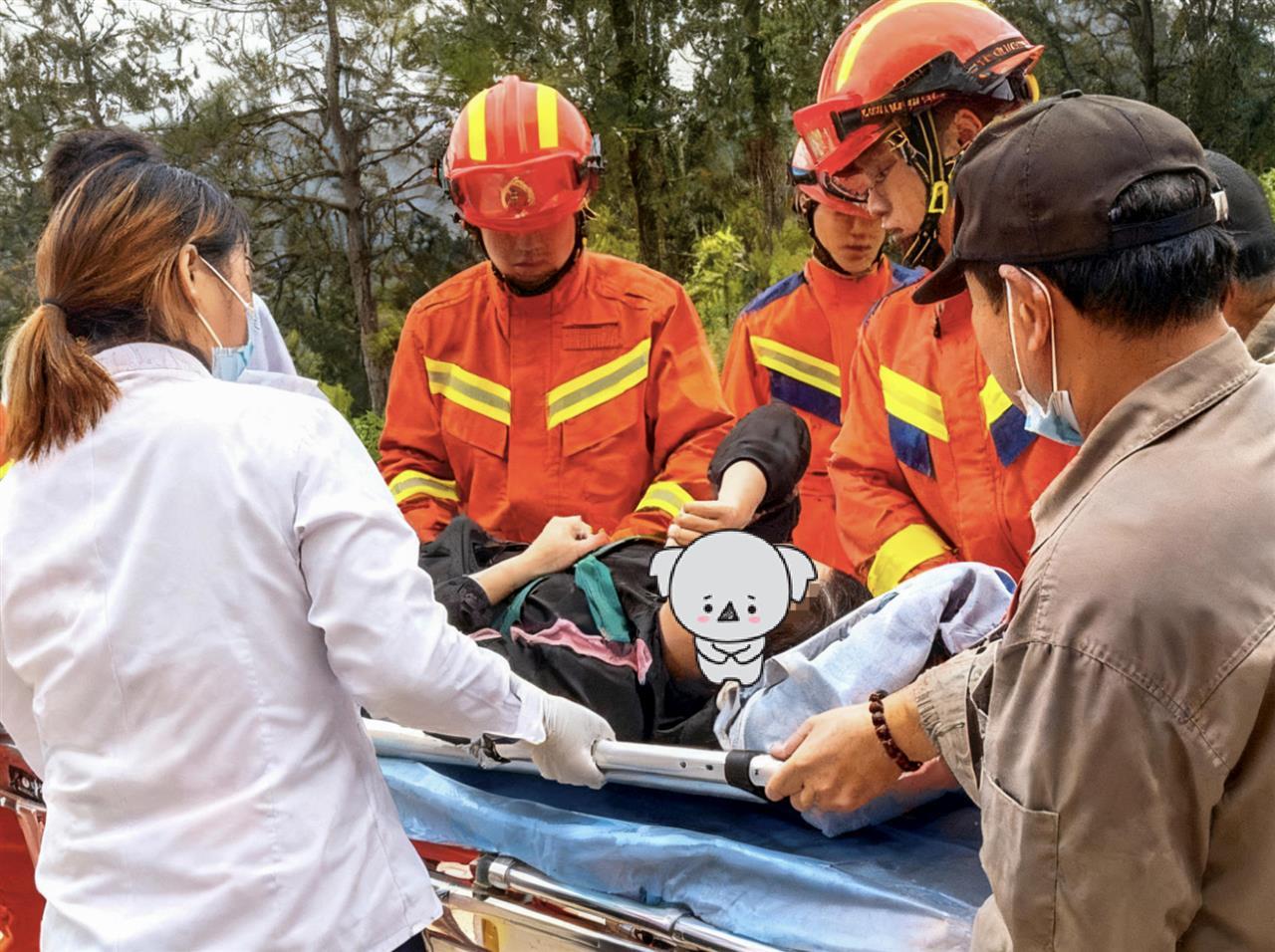 消防员赶赴现场途中,尝试与受伤女子联系确认被困位置,因山中信号极差,仅能获得模糊定位。消防员徒步翻越多个山坡进行搜寻,30分钟后在山顶成功找到了该女子。经现场沟通了解到,受伤女子在爬山途中因山路湿滑不慎崴伤左小腿,导致无法继续行走,医护人员在初步诊断后确认为腿部骨折。