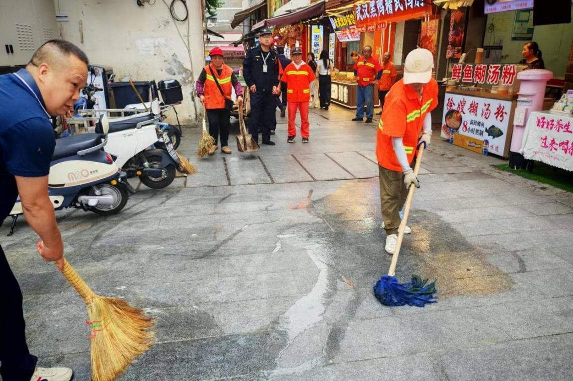 此次行动聚焦网红街区路面油污、绿化带积存垃圾、环卫设施污渍、墙面牛皮癣及卫生死角等问题,由中华路街道牵头,联合武汉天呈祥环卫工程有限公司、武汉禧来泉环保科技有限公司、户部巷商会、美团外卖及辖区“红巷”志愿者、“家住长江边”志愿者团队和社区居民等多方力量,组建“专业队伍+商户联盟+志愿力量”的清洁及消杀攻坚小组。