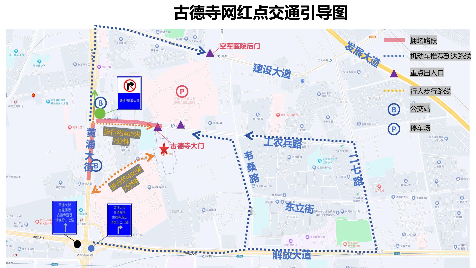 古德寺在9:00-12:30、13:30-17:00人流车流叠加显著,周边黄浦大街(解放大道至建设大道)、长江二桥、工农兵路(黄浦大街至韦桑路)、韦桑路等路段,易因游客上下车、违章售卖摊点占道及共享单车乱停放出现通行缓慢;山海关路(8:00-15:00、8:00-22:00)、巴公房子(9:00-23:00)、吉庆映象(18:00-22:00)、兰陵路(9:00-13:00)、咸安坊等点位,受游客消费、拍照影响,周边中山大道、胜利街、山海关路、鄱阳街、兰陵路、洞庭街、交易街、黄石路等路段人流车流交织,通行效率会明显下降。