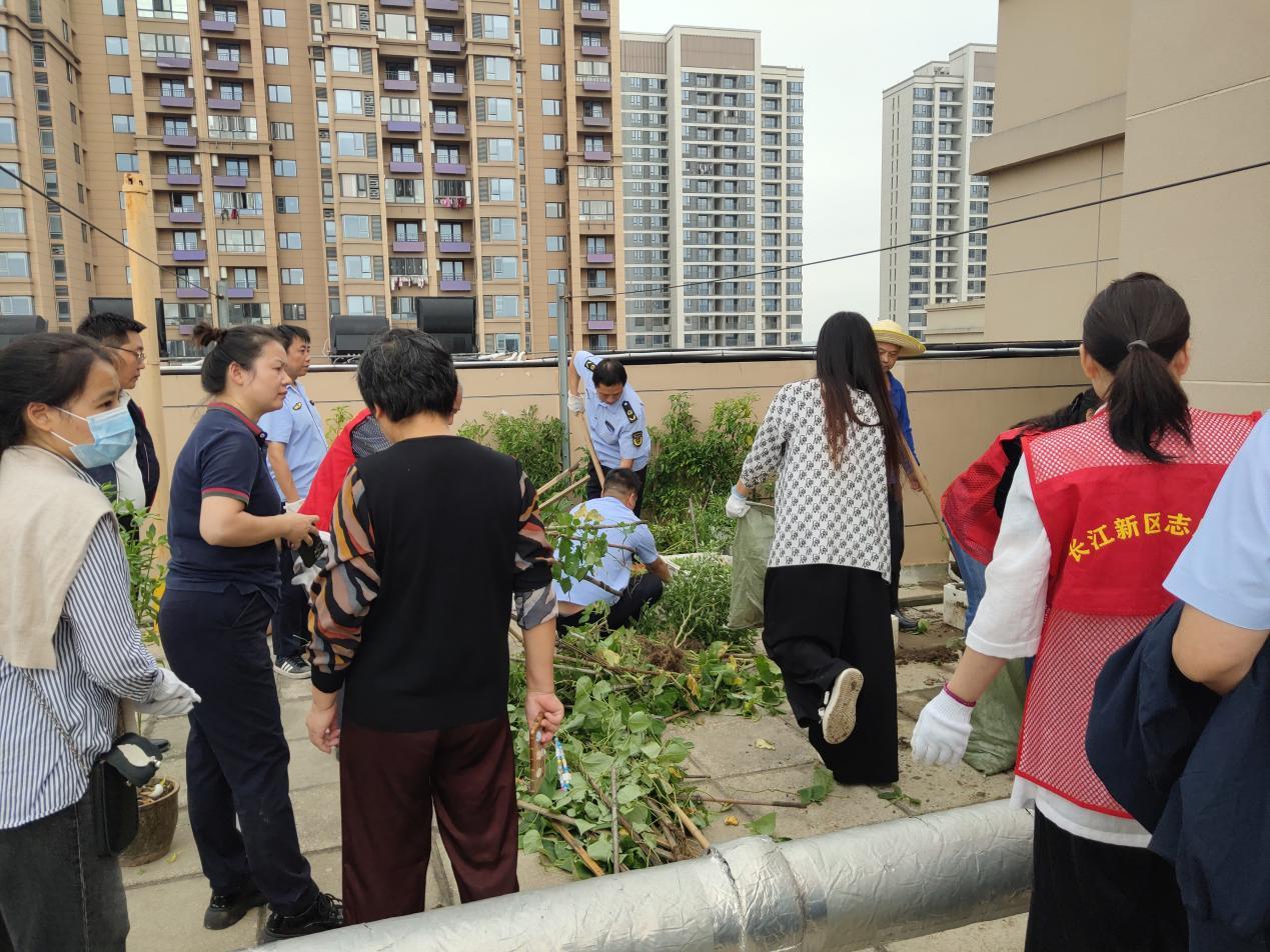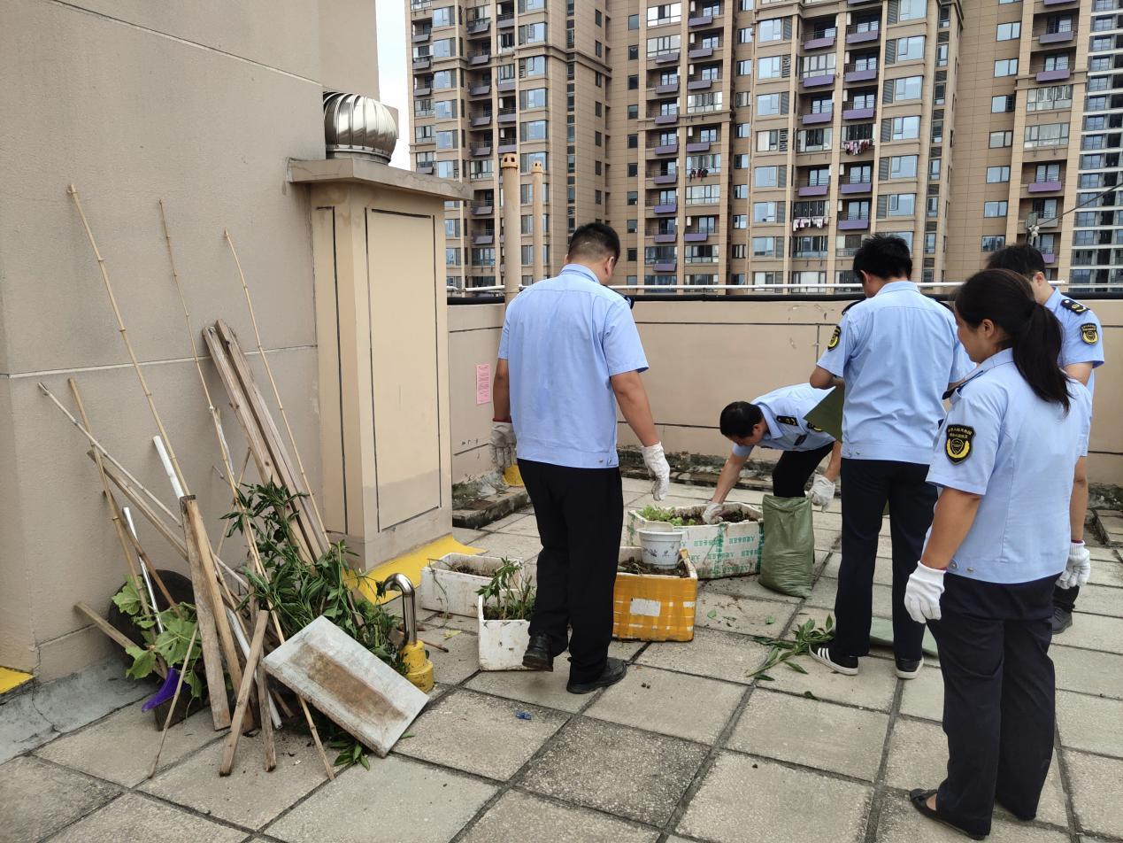 时隔10天,9月26日,一场预防基肯孔雅热的专项清理行动又在小区内展开。此次,游湖社区居委会再次牵头,联合新福物业、社区志愿者及谌家矶街道综合执法中心,对小区楼顶违规种菜种花现象进行整治。