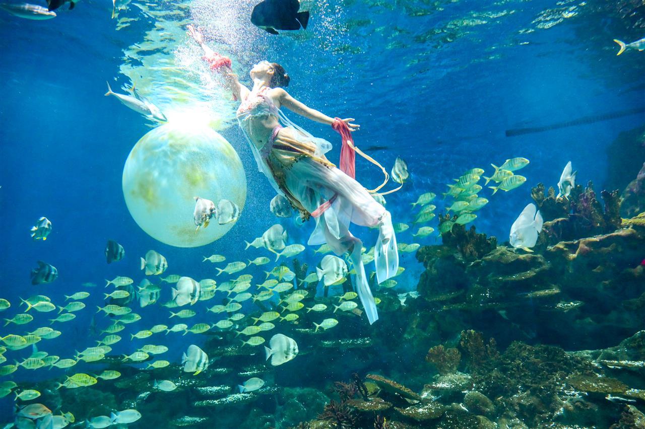 在海洋王国的海底环游池,一场“水下嫦娥奔月”正在浪漫上演。几位身着汉服的美人鱼化身传说中的仙女,环绕水中圆月翩跹起舞,优雅舞姿与飘逸形态引得观众目不转睛,小朋友们更是情不自禁地鼓掌欢呼。游客袁女士一边用手机记录一边赞叹:“第一次看到这样的表演,美人鱼结合古风造型,非常吸睛,创意十足!”