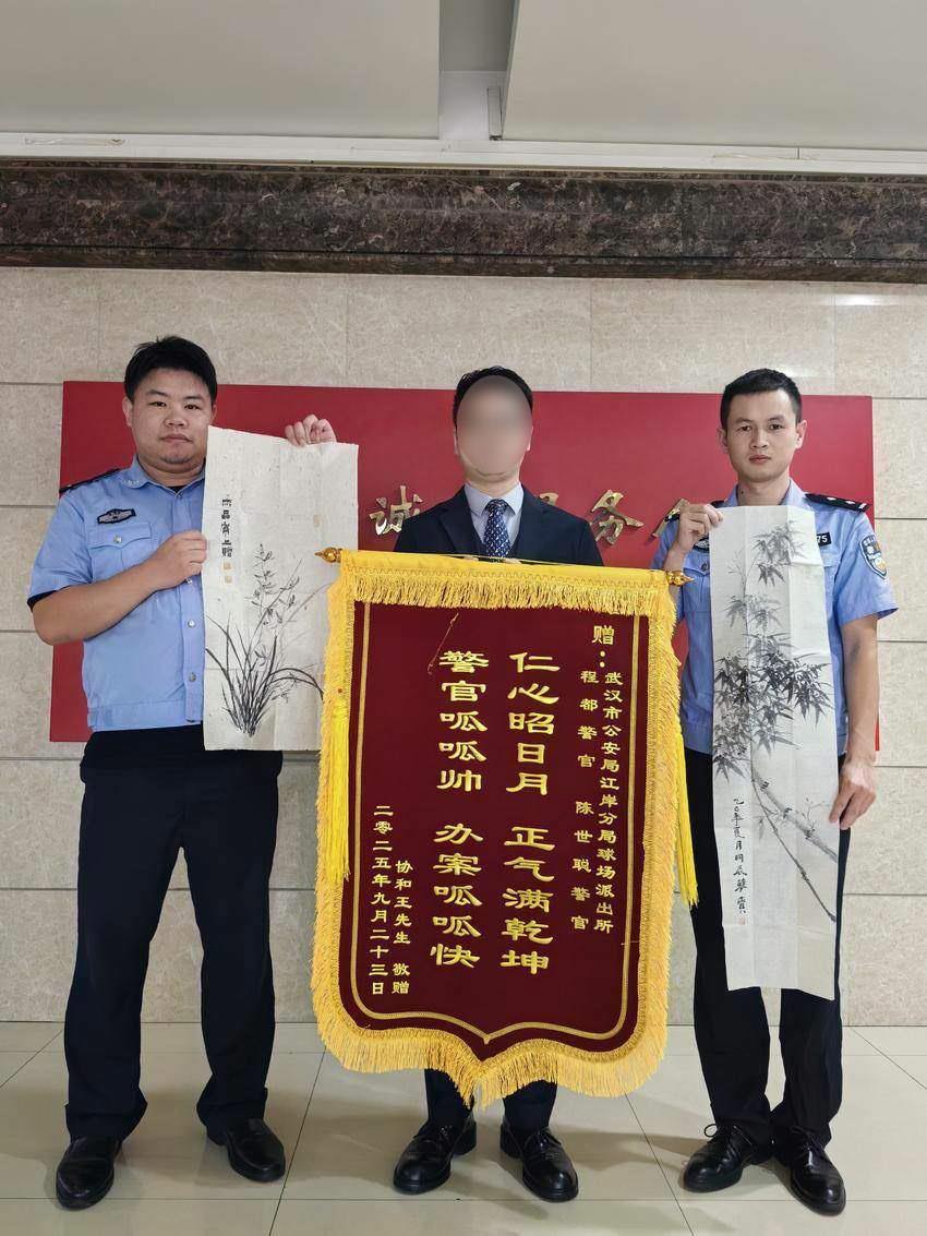 9月25日上午,收到失而复得的包包后,王先生难掩激动之情,特地制作了一面写有“高效办案暖民心、尽职尽责显担当”的锦旗,还带上自己亲手绘制的国画,专程来到球场街派出所,将锦旗和画作送到民警陈世聪、辅警程都手中,再次对两人高效细致的服务、为民办实事的态度表达由衷感谢。