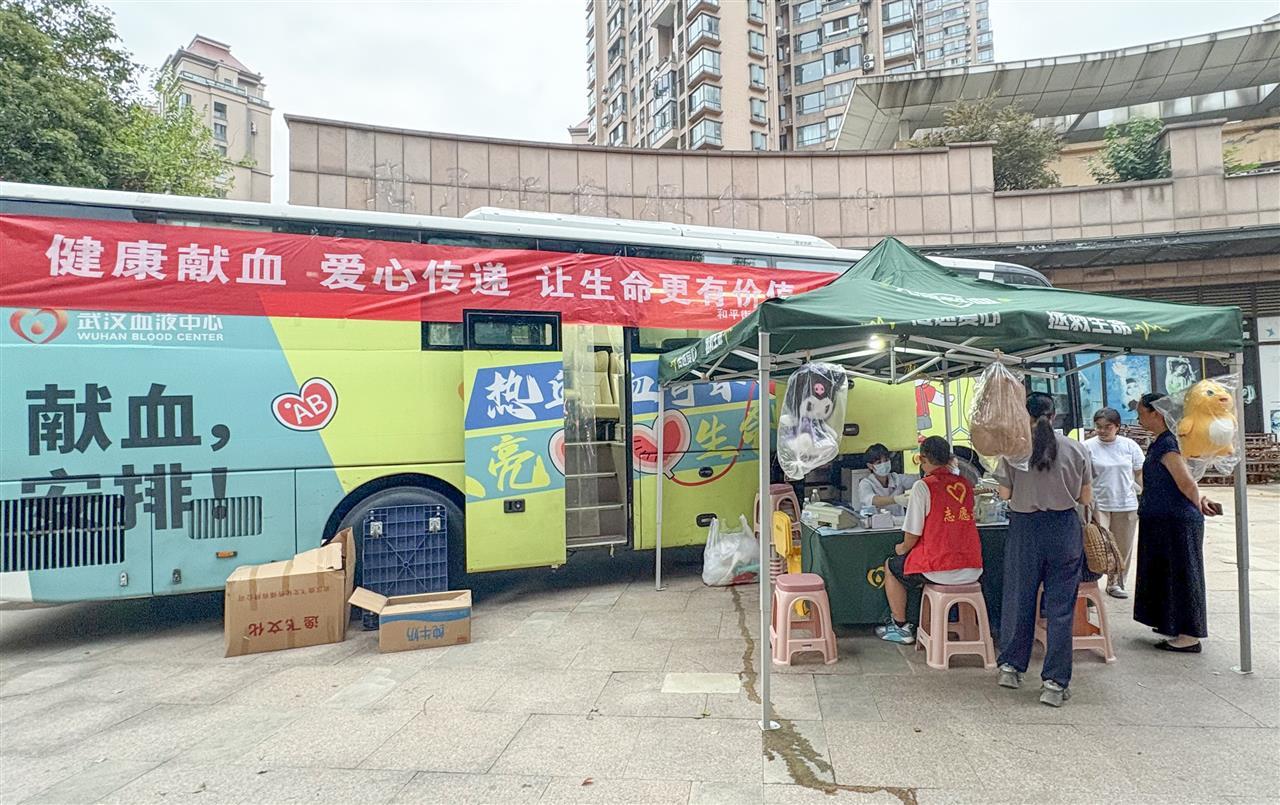国庆献热血,爱心暖万家。活动现场不仅有精彩的文艺展演,还涌动着温暖的奉献力量。在社区旁的献血车上,5位热心市民主动挽起衣袖,参与无偿献血公益活动。他们中有常年参与社区文体活动的舞蹈学员,有共建高校武汉理工大学航运学院明日星海志愿服务队的大学生,有专门前来献血的爱心居民。鲜红的血液承载着“爱家人”的善意与担当,为节日增添了一份特殊的温暖底色,也让“奉献、友爱、互助”的社区精神在实践中熠熠生辉。