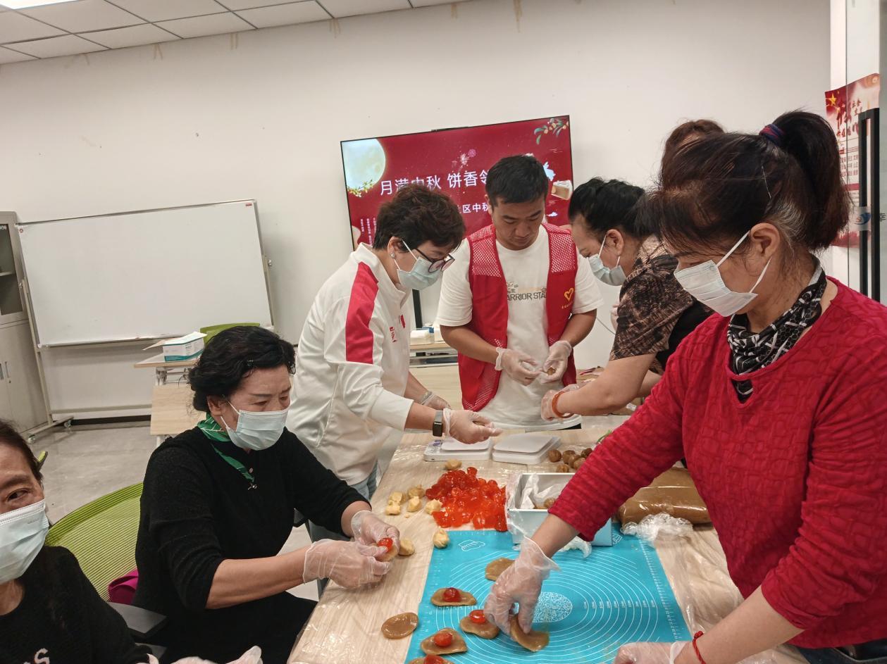 动手制作环节开启。居民们分成若干小组,戴上一次性手套,拿起材料开始实践。揉面团、分馅料、包月饼、压模具……大家分工协作,互相帮忙,遇到难题就向老师或身边的“能手”请教。活动室内笑声不断,邻里间的陌生感在不知不觉中消散,温情在指尖流转。制作完成后,大家小心翼翼地在月饼上标注姓名,由工作人员统一送入烤箱烤制。