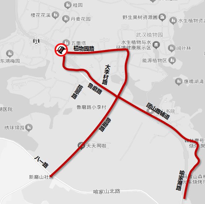 鲁磨路(八一路至樱花园大门)、植物园路(鲁磨路至团山路)、团山路辅道(喻家湖路至团山路)。