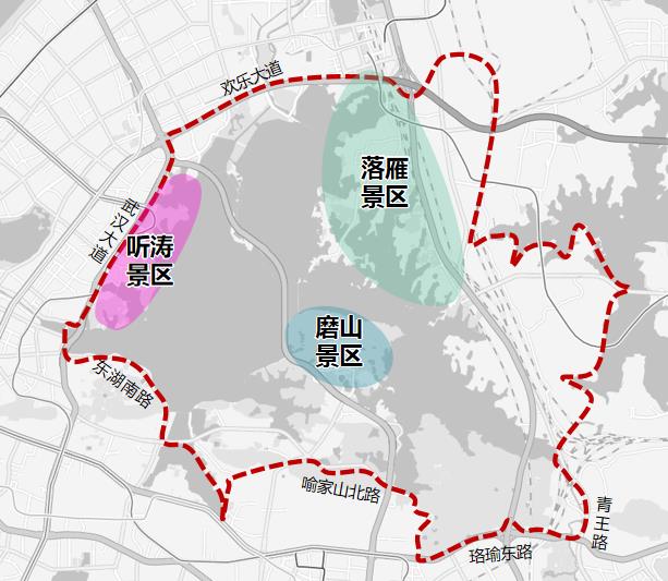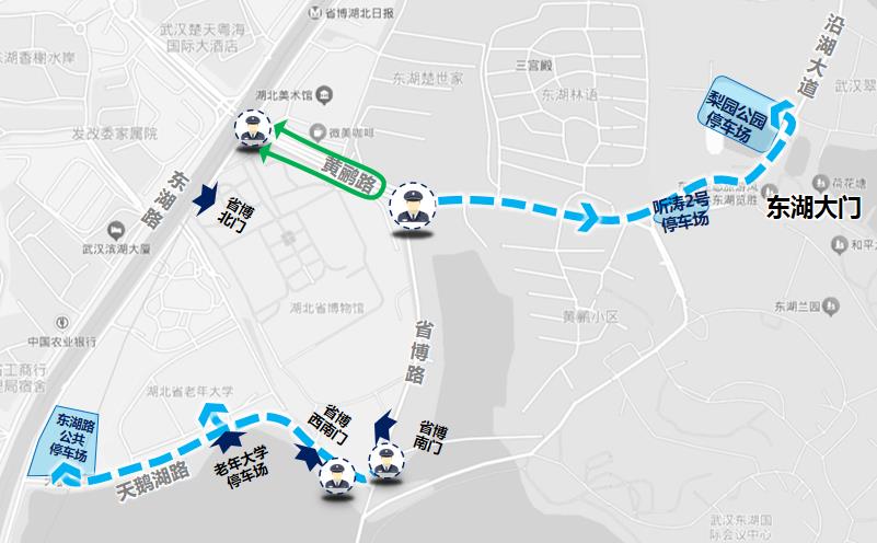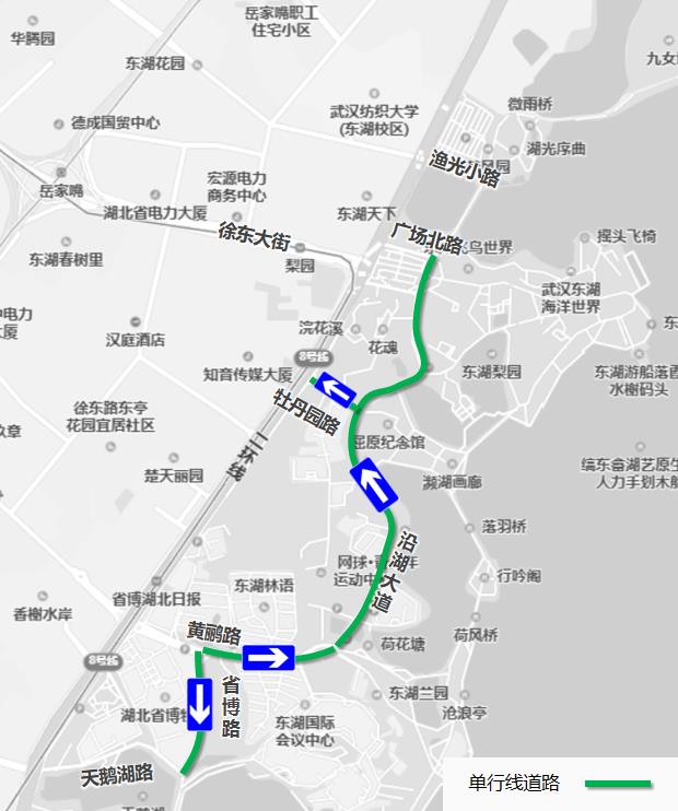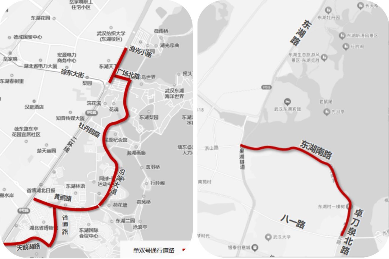 二环线梨园下穿通道地面层(徐东大街至渔光小路)、沿湖大道(黄鹂路至广场北路)、广场北路、黄鹂路(东湖路至东湖大门)、省博路(黄鹂路至天鹅湖路)、天鹅湖路(东湖路至省博路)、东湖南路(洪山路至卓刀泉北路)、卓刀泉北路(东湖南路至八一路路口)。
