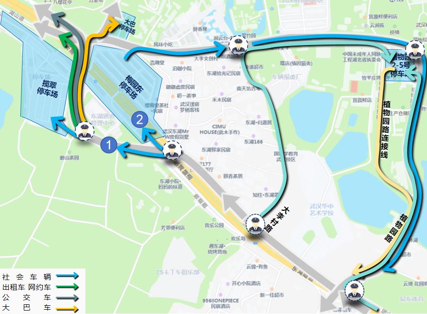 车多时,直接去植物园2-5号停车场、①号揽翠停车场(磨山樱花停车场)最稳妥。请注意!揽翠路可能会临时管制,听交警叔叔指挥就好!