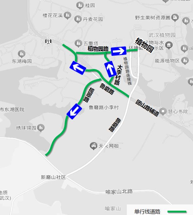 ②植物园路(植物园至鲁磨路)只能由西向东(鲁磨路往团山路方向)单向通行。