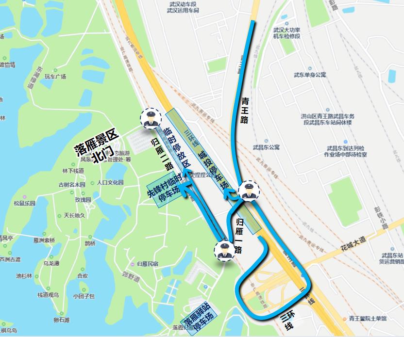揽翠停车场(磨山樱花停车场)北侧绿道设置即停即走专用通道,下客即走,别逗留哦!