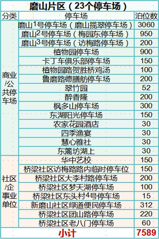 磨山片区设有23个停车场,共7589个停车泊位可供选择。