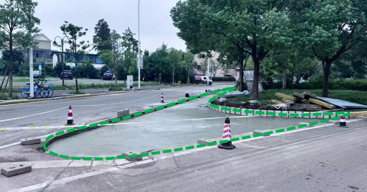 消减梅园东停车场门前部分停车位及路中绿化带区域,扩宽停车场进出口通道及转弯半径,增加驶入停车场专用通道,理顺大巴车驶入停车场转弯半径,提高停车场通行效率。