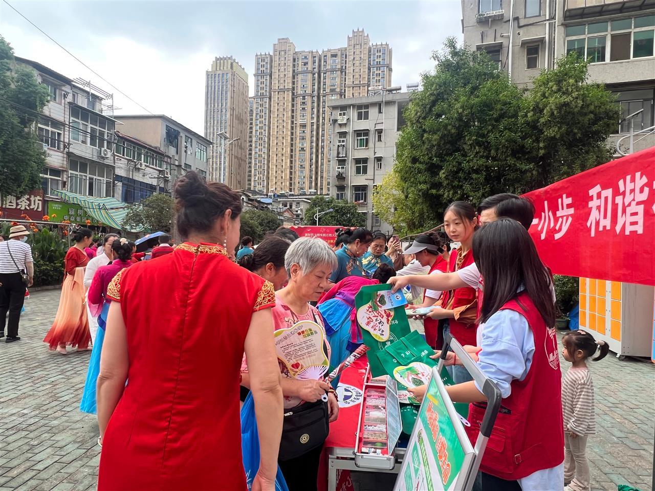 活动中,吴家山街综治中心与社区戒毒康复中心工作人员及志愿者同步开展禁毒、反诈与平安建设宣传,通过发放资料和现场讲解,在节日欢庆中融入安全教育,提升居民防范意识。