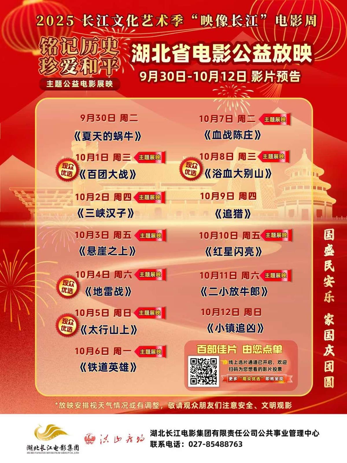 为了纪念中国人民抗日战争暨世界反法西斯战争胜利80周年,引导市民游客特别是青少年深刻认识抗日战争胜利的伟大意义,深刻感悟今天和平幸福生活的来之不易,由湖北省委宣传部指导,湖北长江电影集团和武昌区城管执法局洪山广场管理处共同主办“铭记历史,珍爱和平”主题公益电影展映活动。活动将于每晚7点在洪山广场林荫休闲广场播放一部爱国主义影片(影片以当天播放为准,遇恶劣天气停播顺延),影片包括《百团大战》《三峡汉子》《悬崖之上》《地雷战》《太行山上》《铁道英雄》《血战陈庄》《浴血大别山》等。