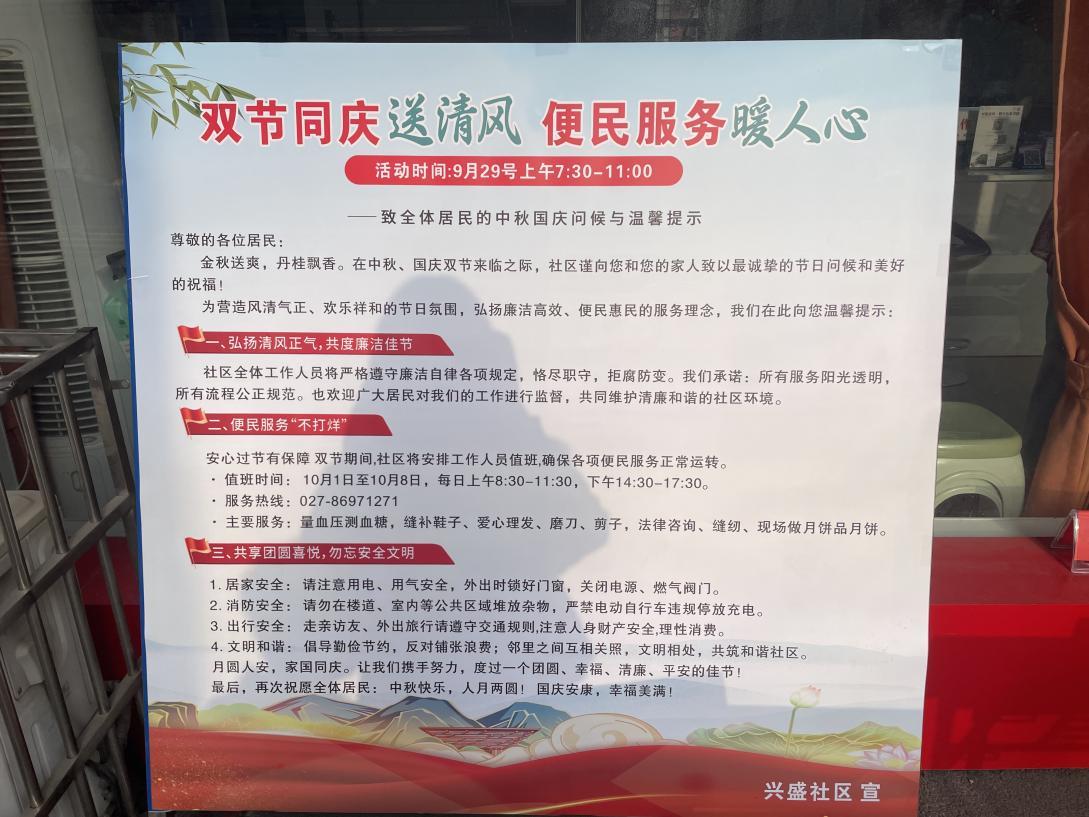 金秋送爽,丹桂飘香,在中秋、国庆双节即将到来之际,为深入践行“以人民为中心”的发展思想,切实解决居民生活中的“急难愁盼”问题,同时持续推进清廉社区建设,营造风清气正的社区氛围,武汉兴盛社区以“双节同庆送清风 便民服务暖人心”为主题,精心策划并组织开展了一场集便民服务、节日互动与清廉教育于一体的综合性社区活动,让居民在浓厚的节日氛围中感受到社区的关怀与温暖,让清廉新风浸润社区每个角落。