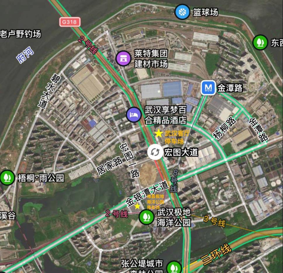 武汉极地海洋世界位于宏图路与金银潭大道西南角,设置东、北2个进出口,分别位于宏图路、金银潭大道。预计“国庆”期间,宏图路、金银潭大道区域道路交通压力较大: