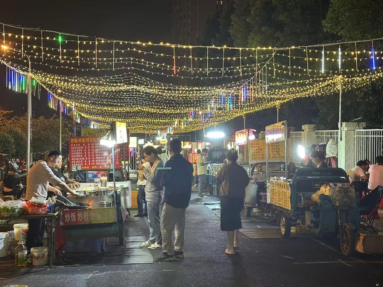 经过多方协调与努力,李刚说服企业,巧妙利用充电站旁的部分闲置区域,统一划定经营区域,督促摊贩办理健康证、铺设防油布,配备合规的燃气用具和灭火器,安装缤纷的彩灯装饰,确保经营有序、卫生达标、安全可控,打造了“中芯一路夜市”。“我们企业也愿意为城市共治尽一份力,拿出一些面积换来周围四十多家摊贩的安稳经营,我们不觉得亏。”充电站负责人表示。
