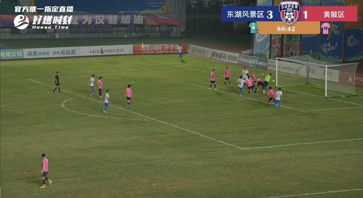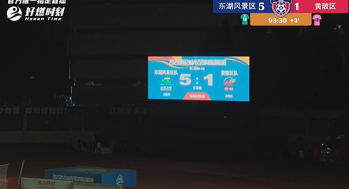 规定时间最后2分钟,东湖风景区队角球将球送到门前,黄陂区队门将落点判断失误,11号队员果断出击,头球破门,将分差扩大至三球,提前锁定胜局。