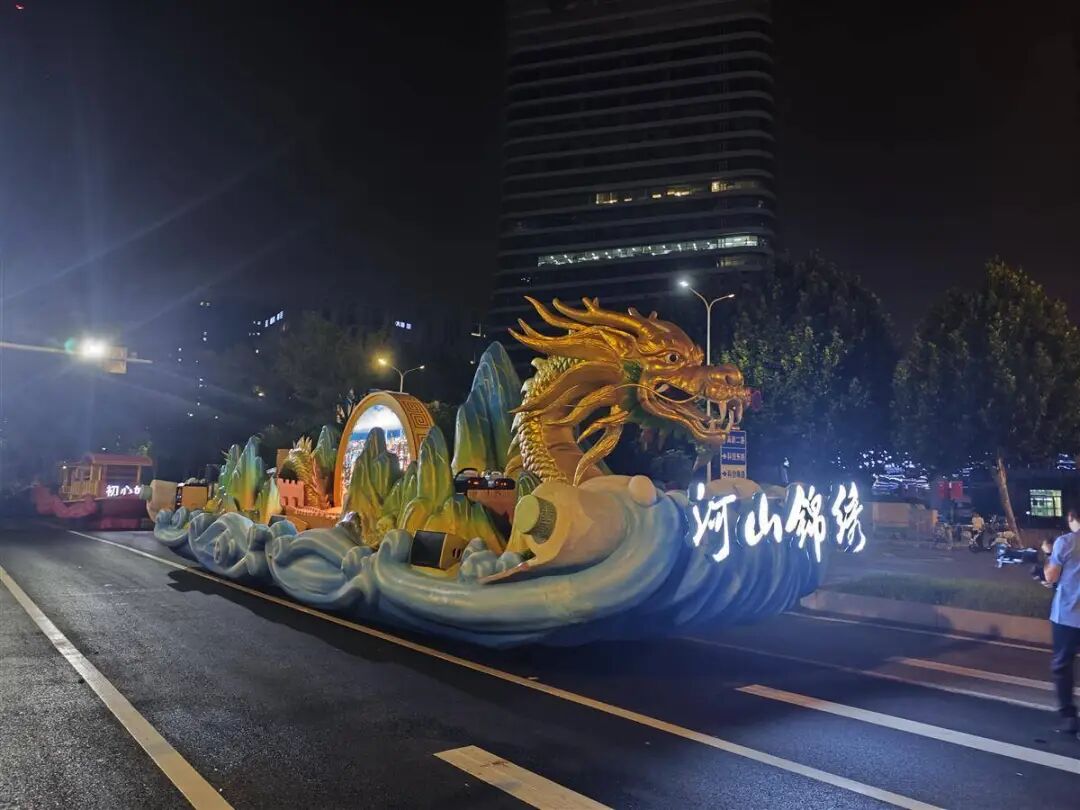 例如,首辆花车“河山锦绣”以《千里江山图》为灵感,金色巨龙穿梭于青绿山水之间,车身融合长城、烽火台等符号,并配备机械龙头装置,可实现俯仰、喷烟雾等动态效果,营造出“云山雾绕”的意境。
