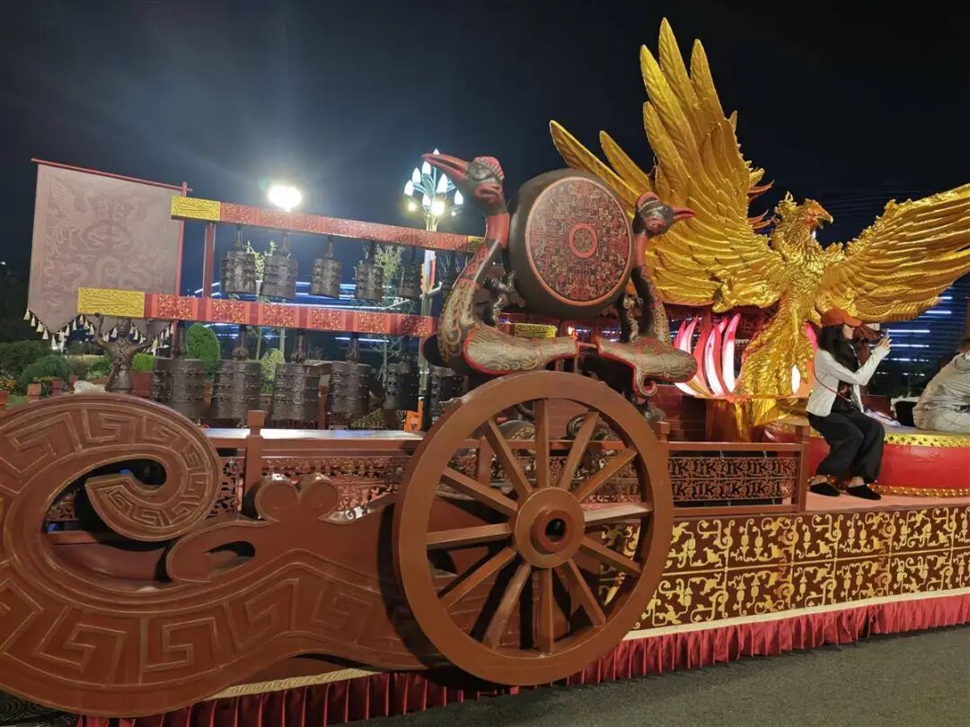 另一台代表武汉特色的“楚风汉韵”花车则浓缩当地文化精髓:振翅金凤屹立于黄鹤楼前,底座为虎座鸟架鼓,车尾装饰编钟阵列,以朱红为底、鎏金勾勒,再现楚文化的绚烂风华。
