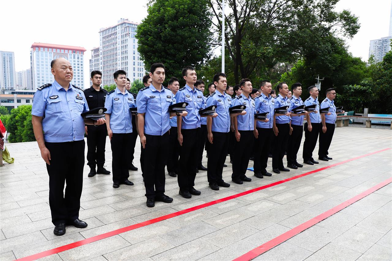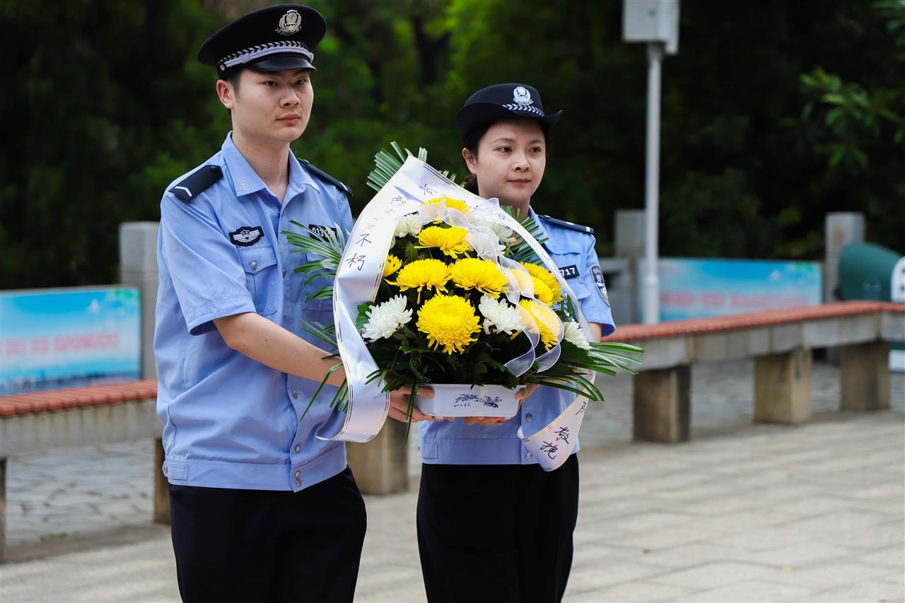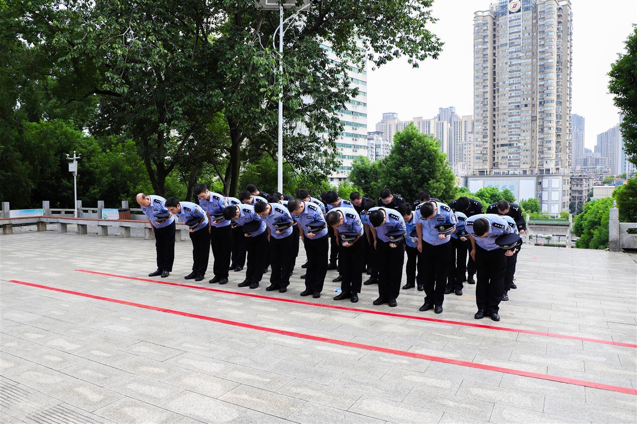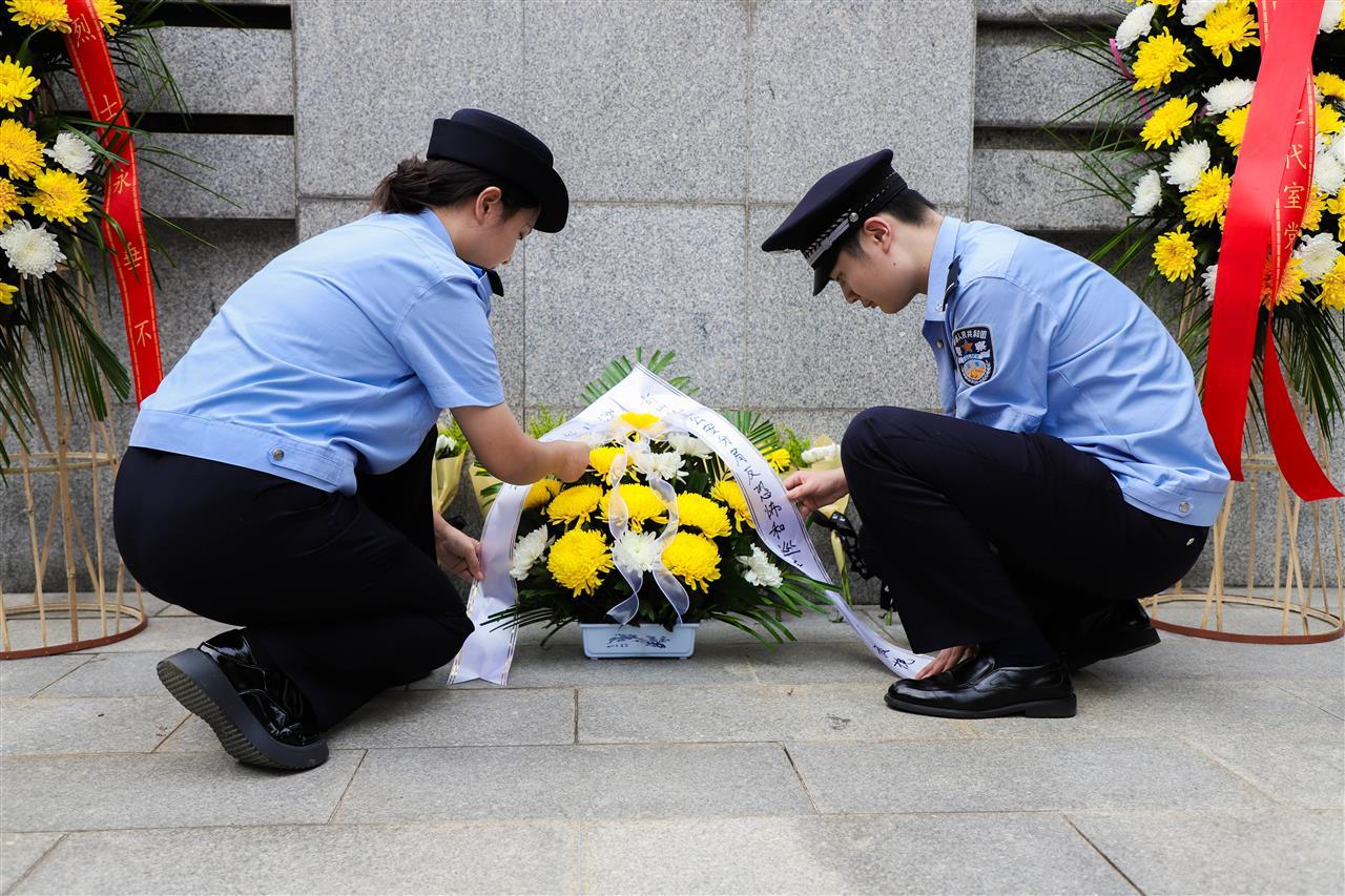 庄严肃穆的烈士纪念碑前,两名新警缓步走向纪念碑基座,并轻轻献上花篮;其余人员垂首默哀,用无声的方式向施洋烈士致敬。
