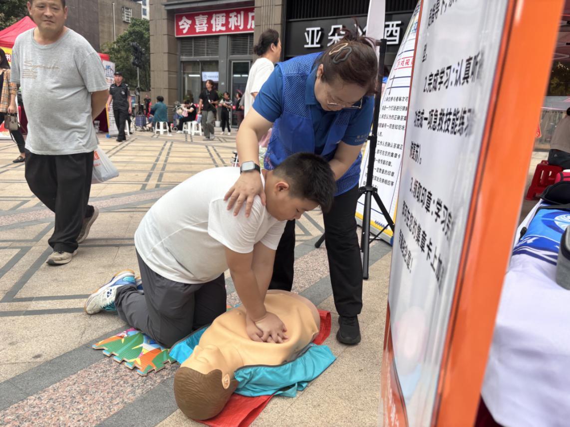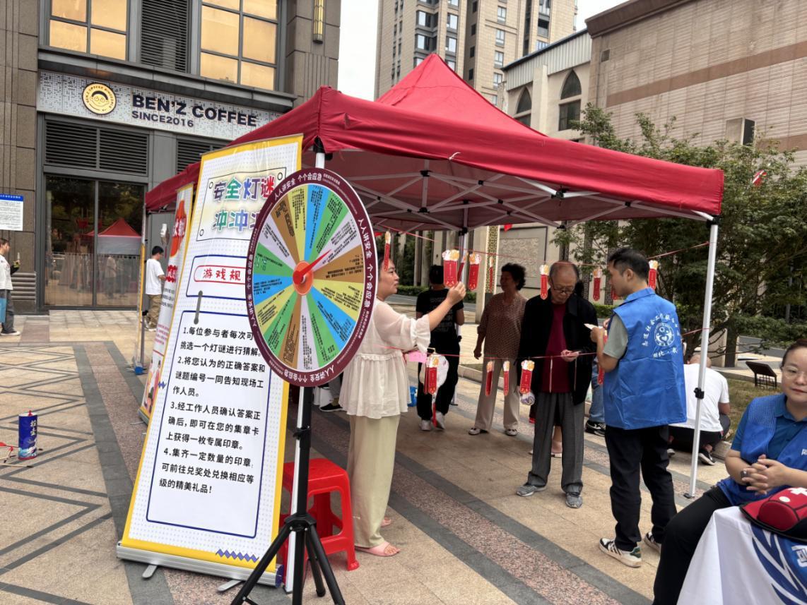 活动在下午3点准时开始,居民们陆续签到并领取集章卡,开启了一段充满知识与温情的体验之旅。现场特别设置了丰富多彩的中秋主题互动区域与安全教育板块。在“安全教育核心区”,“消防知识大转盘”互动游戏吸引了众多居民参与,通过趣味问答的方式,让居民在游戏中轻松掌握火灾预防、应急逃生等关键知识。同时,蓝天救援队的老师还系统讲解了心肺复苏、止血包扎等基础应急救援知识,并借助教学模拟人邀请居民动手实操,让大家在突发情况面前能够敢于施救、正确施救,切实提升了居民的综合安全素养。