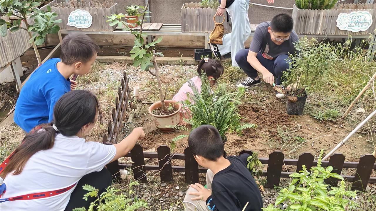 在梧桐老师的指导下,大家开始动手种植:先帮植物“脱盆”,去掉部分外层土,接着挖坑、施底肥、铺椰糠、再覆土浇水……每一个步骤都认真细致。老师还提醒,叶子太密的植物,最好摘掉底部几片叶子,这样新芽才能长得更好。