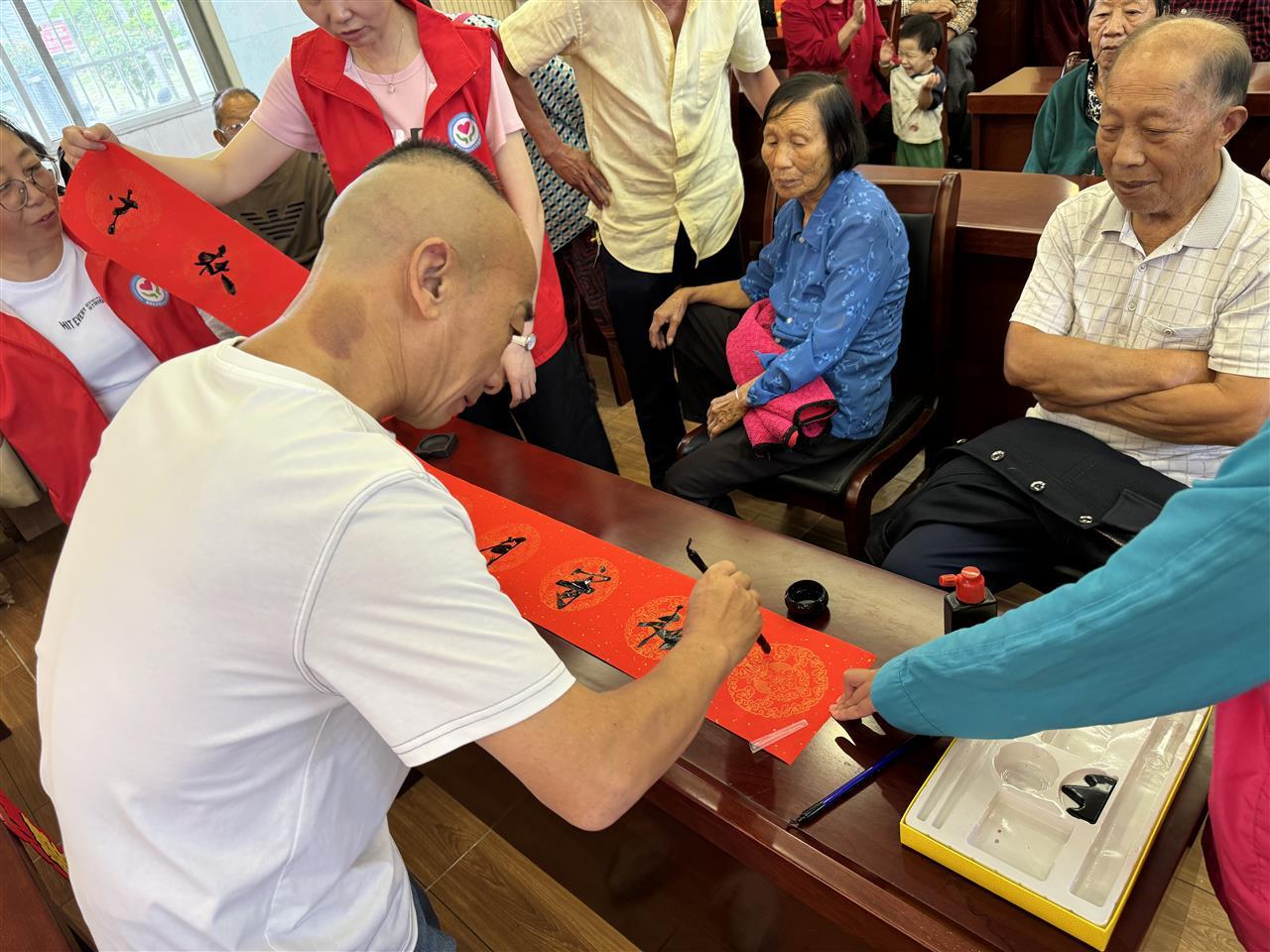 当文化氛围愈发浓厚时,活动迎来最具韵味的环节——谢文才老人的书法展示。只见谢老手握毛笔,凝神静气,笔尖轻蘸墨汁,朱纸承书,从容挥毫。“中秋快乐”“明月寄相思 中秋团圆夜”等字样笔力遒劲、墨香四溢,一笔一划间尽显传统书法的风骨与韵味,更将对节日的美好期许凝于笔端。作品完成的瞬间,现场响起阵阵掌声与赞叹,老人们纷纷驻足欣赏,感受着中华优秀传统文化的独特魅力。