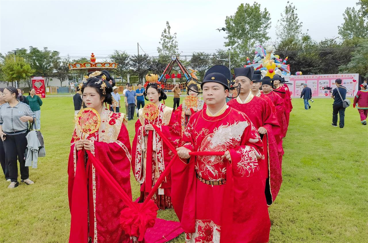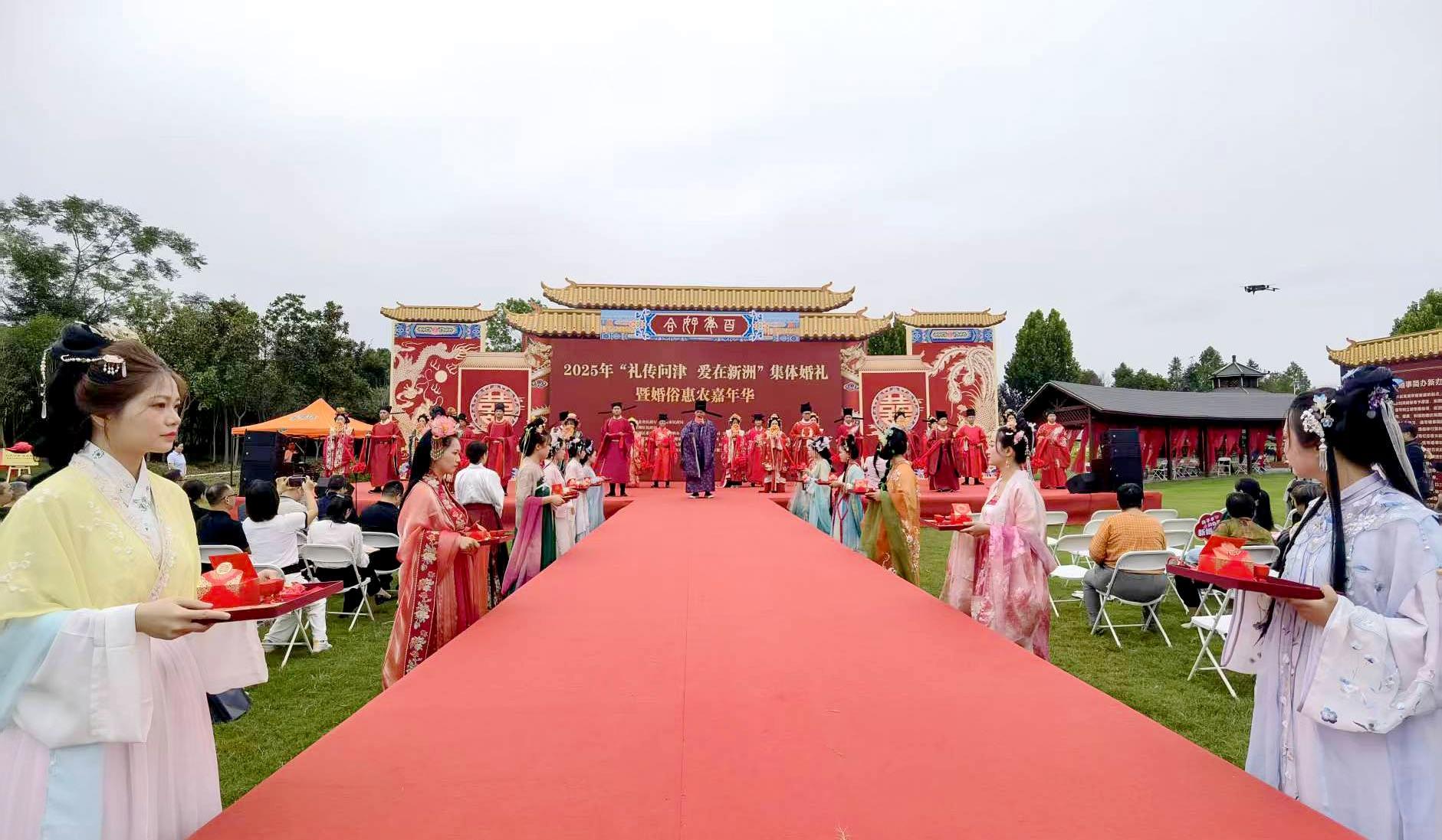 吉日良辰,稻田相约。9月29日,2025年“礼传问津 爱在新洲”集体婚礼在武汉市新洲区稻田记忆生态园举行。十二对新人身着华美宋制婚服,执红绸、踏锦毯,在“十二花神”引导与亲友见证下,以一场典雅庄重的中式集体婚礼,倡树婚事新办、简办的文明新风,开启婚俗改革与乡村振兴同频共振的崭新篇章。