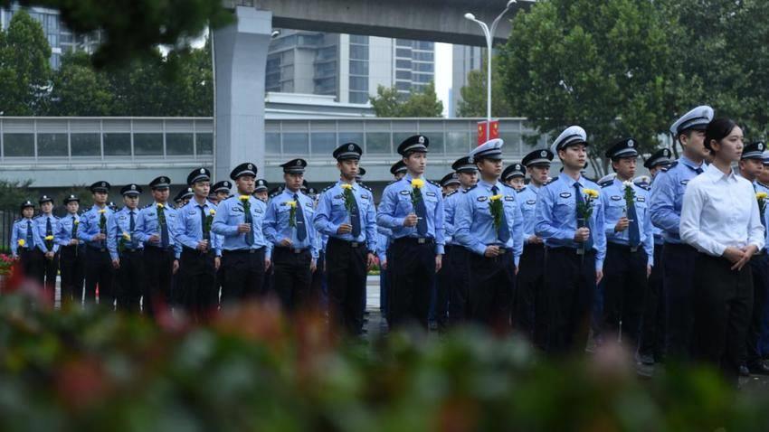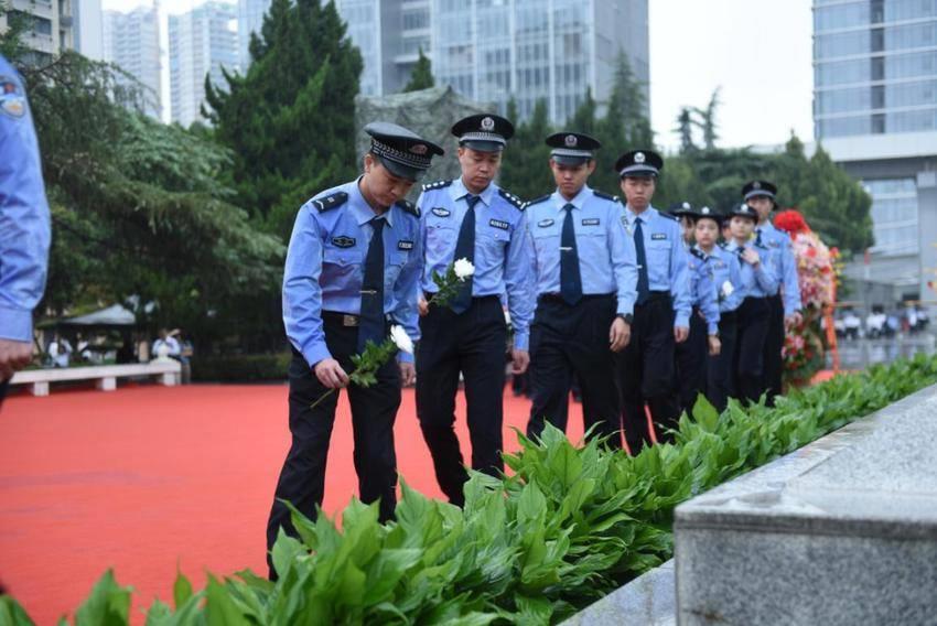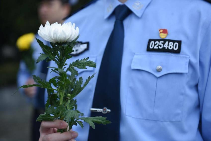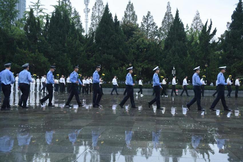 上午10时许,公祭仪式正式开始。阴沉的天空飘起细密的雨丝,淅淅沥沥地落在民警的肩头。“立正!”“脱帽!”一声令下,全体民警挺拔身姿,缓缓摘下警帽,雨势渐大,豆大的雨点砸在地面溅起水花,似天地共寄的哀思。随即,民警手持白菊,缓步走向纪念碑,将寄托着无限哀思的一朵朵鲜花轻轻敬献于碑前。