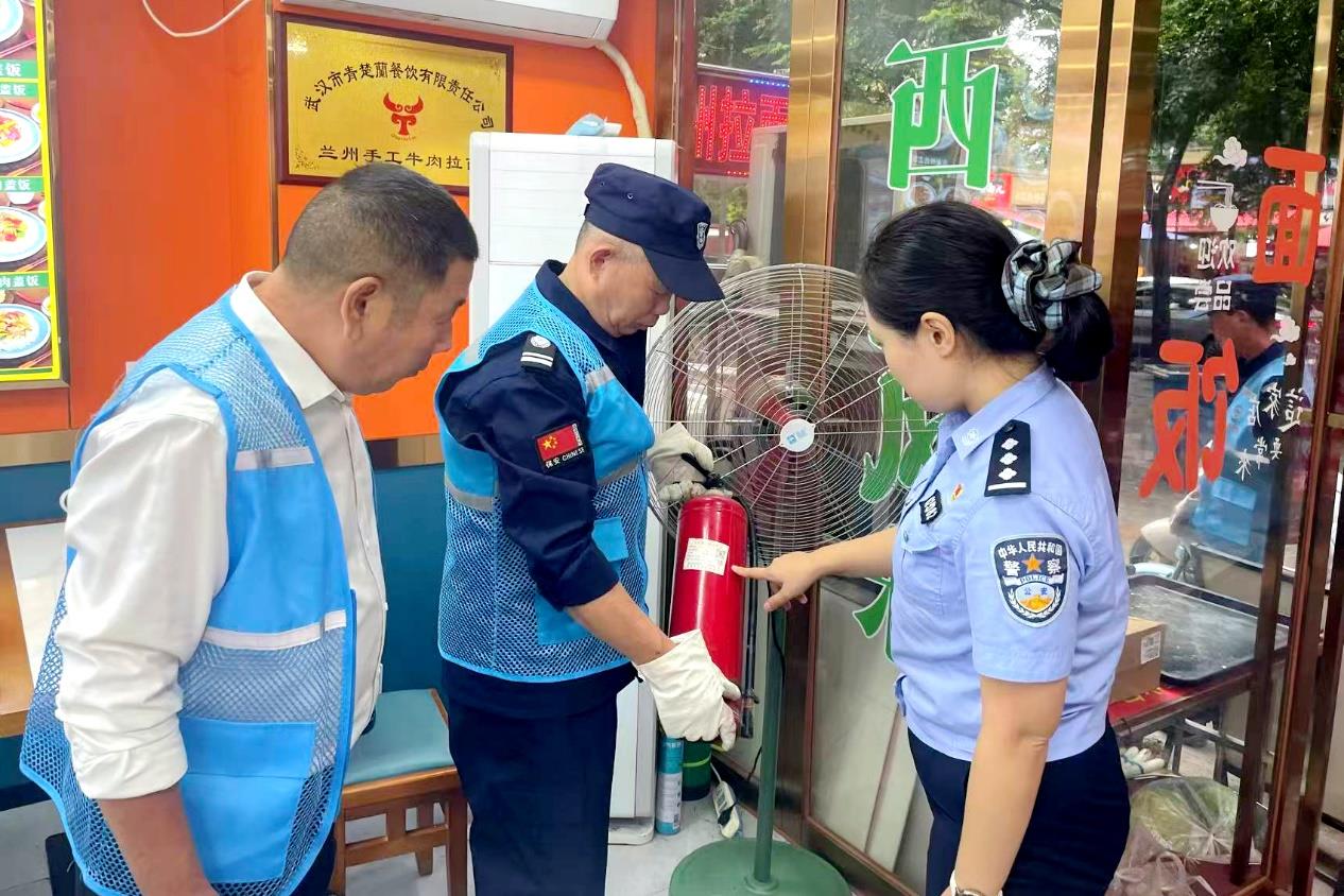 在百步亭幸福时代小区,民警和“百步义警”联合开展节前安全排查,筑牢假期安全屏障。“很多火灾都是小问题引起的,比如电线老化、乱堆杂物等,过节期间客流量大,一定要提前消除隐患。”民警韩玲梓对辖区的商铺负责人叮嘱道,并对出现的隐患及时责令负责人整改。