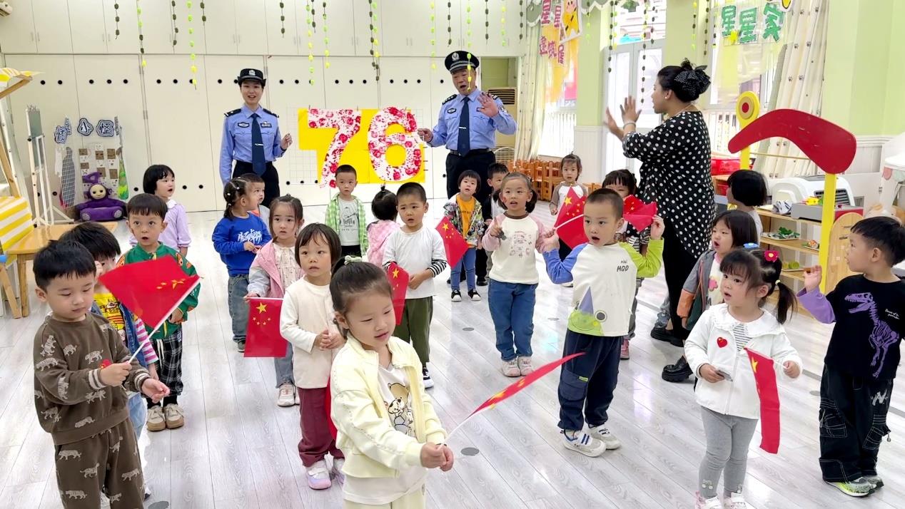 “不能跟陌生人走,不吃陌生人给的食物,遇到困难找警察。”入园不到一个月的小班娃娃们用稚嫩的声音跟着民警沈胜文、肖子涵学习安全知识,共同祝福祖国生日快乐。