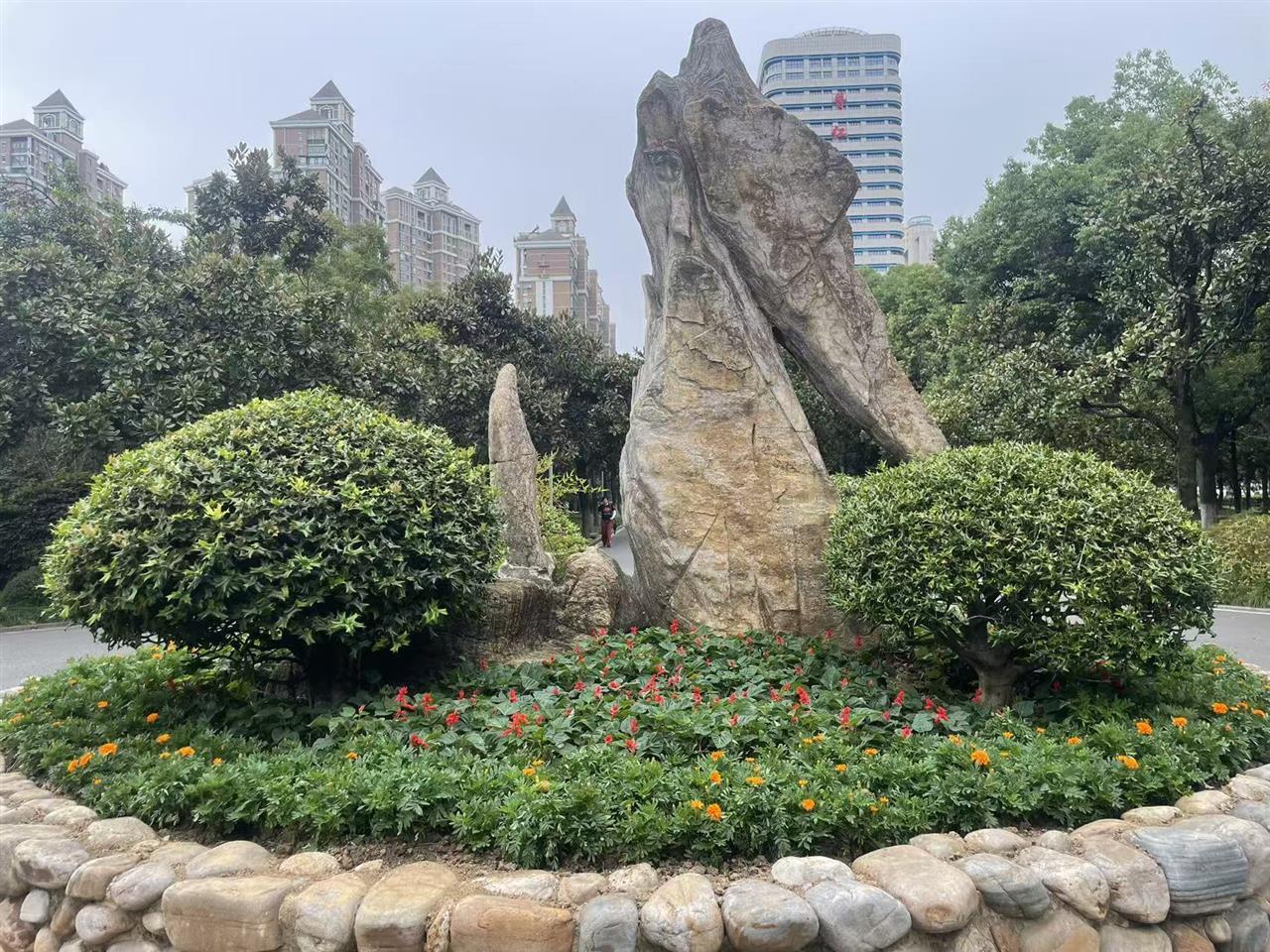 在南门广场、各出入口及中心转盘区域,园艺师以“国旗色彩”为主题进行了精心装点。南门广场花坛中,一串红热烈绽放,橘色孔雀草明媚如阳,红黄交织间,点缀以造型别致的景观石,与周围绿植和鲜花共同构建出层次丰富的生态景观,既呼应国旗的主色调,也寓意祖国的繁荣发展与丰收景象。