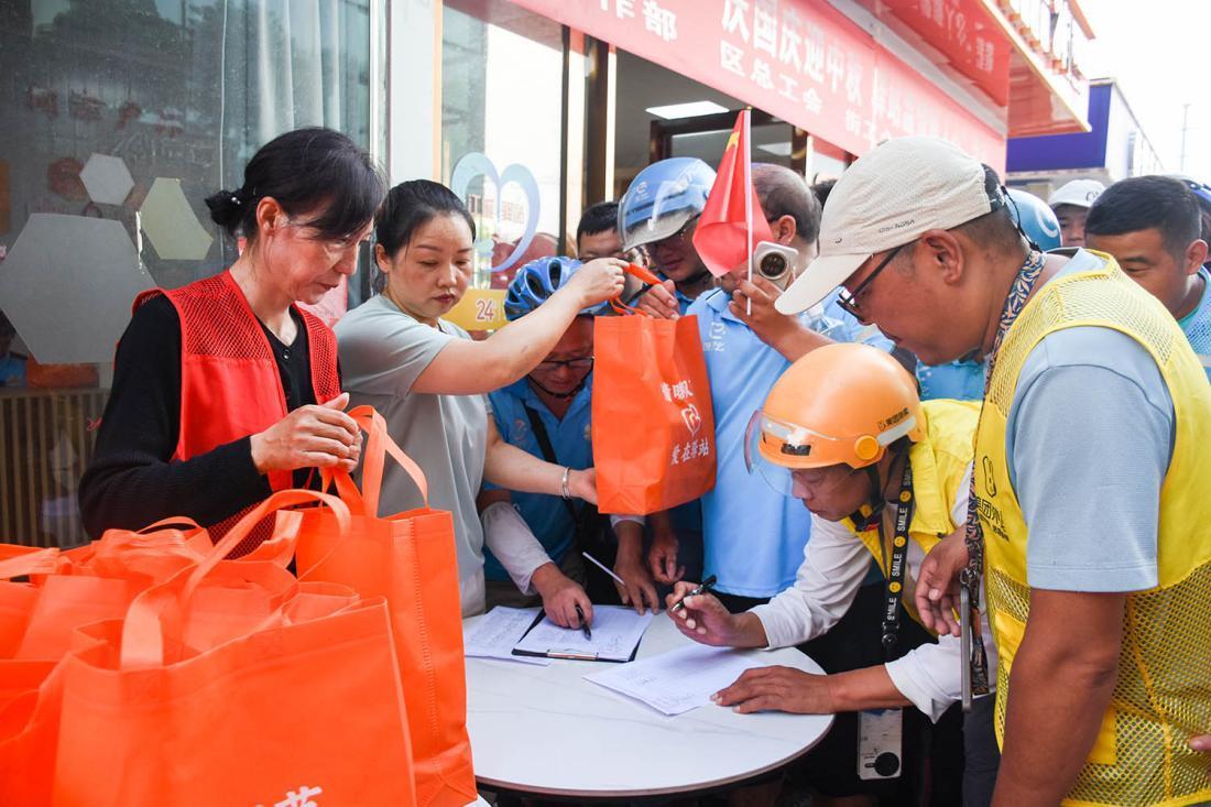最暖人心的当属月饼发放环节。驿站工作人员手捧分装整齐的月饼与矿泉水,逐一分送到户外工作者手中,每递出一份慰问品,都不忘道一句“节日快乐,辛苦了”。接过月饼的外卖骑手李师傅笑着说:“感谢党和政府,没想到能收到这份心意,我的心里比月饼还甜。”