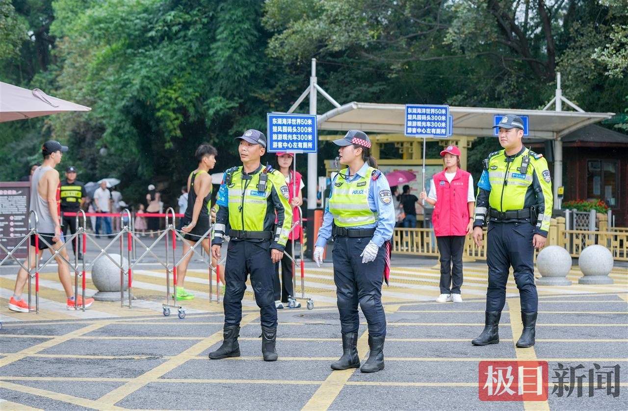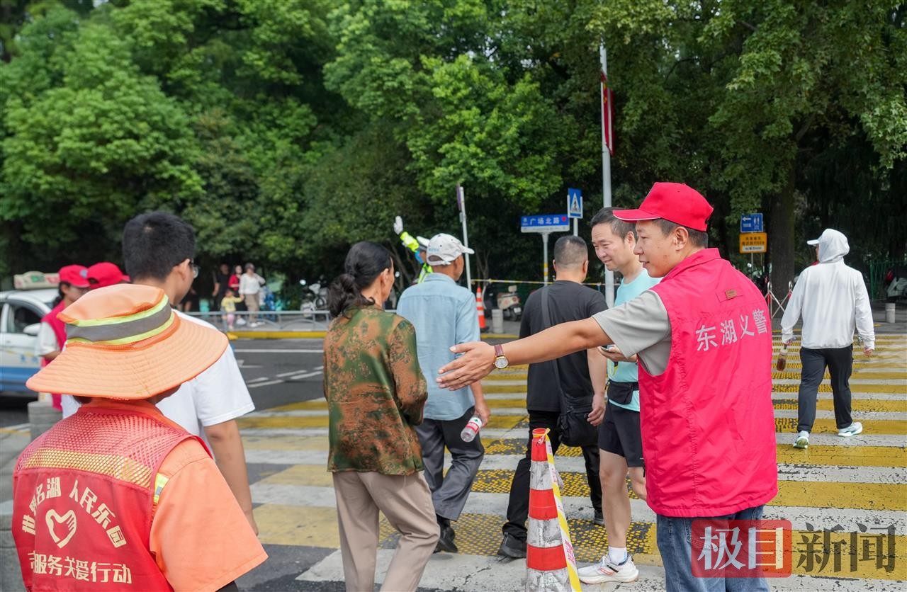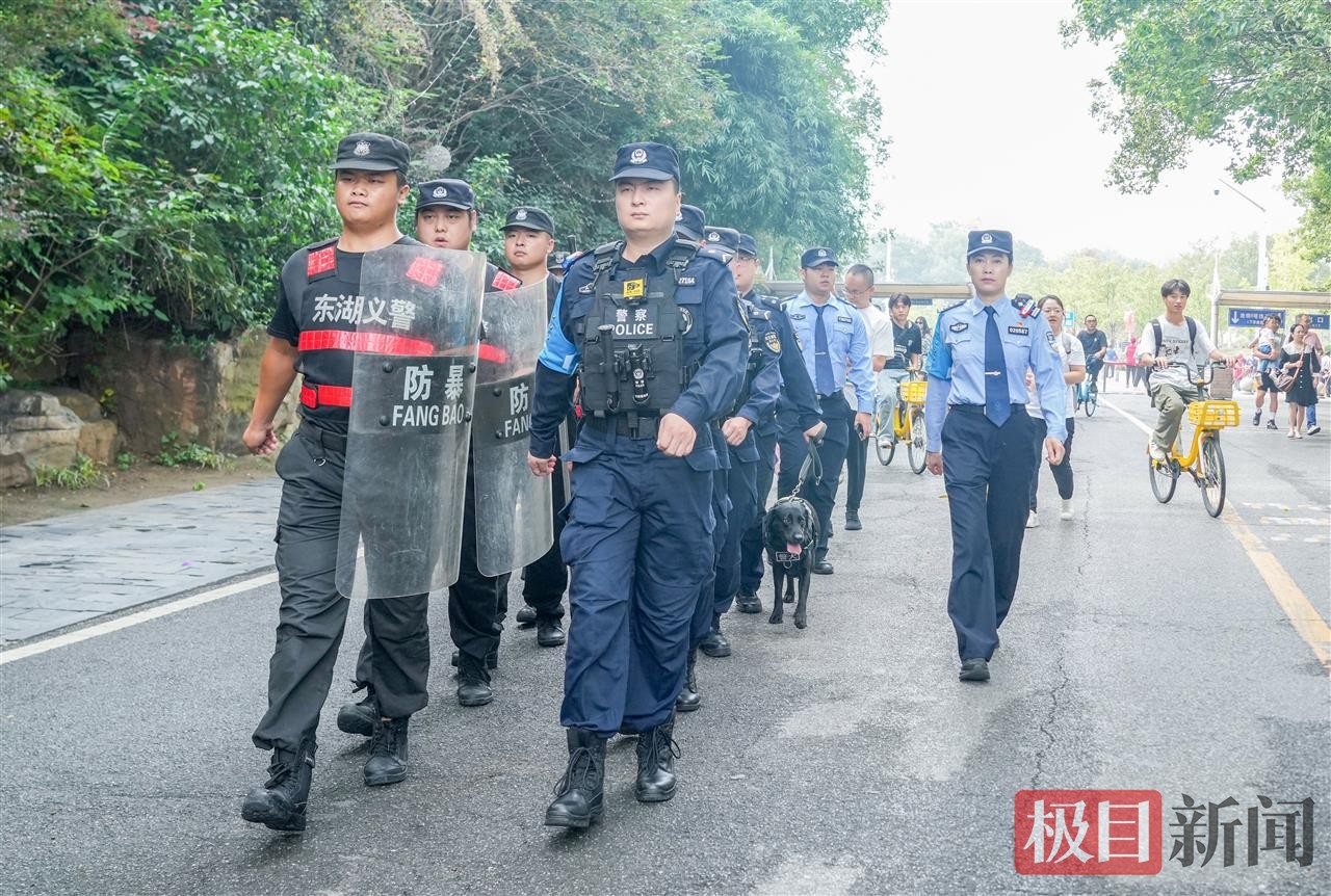 为保障游客安全出行与舒心游玩,东湖风景区周边已形成多警种联动的服务保障格局。在梨园入口周边路段,交警身着反光制服,手持指挥棒精准疏导往来车辆,及时引导社会车辆至指定停车场,有效缓解了节日初期的交通压力;快骑队员骑着警用摩托车穿梭在主次干道,随时处置突发交通情况,为应急通行开辟“绿色通道”;反恐怖和巡特警大队民警携带装备开展常态化巡逻,重点排查入口安检、人员密集区域等关键点位,用“看得见的守护”筑牢安全防线;东湖义警则在景区入口处,协助引导游客过马路,为游客解答路线咨询,成为景区里一道暖心的志愿风景线。
