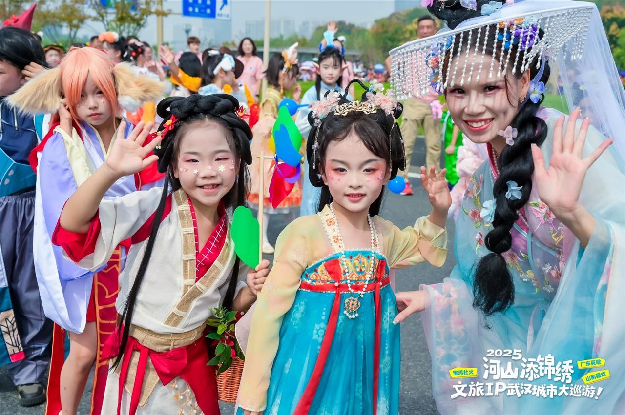 随后,“非遗国潮”“动漫萌宠”“全球狂欢”等主题花车打头阵开启巡游,襄阳、天门、潜江等14辆地市州花车紧随其后,各类元素相互碰撞,中华非遗IP+湖北本土IP+国际IP破圈融合,实现“一次巡游,看遍世界”。