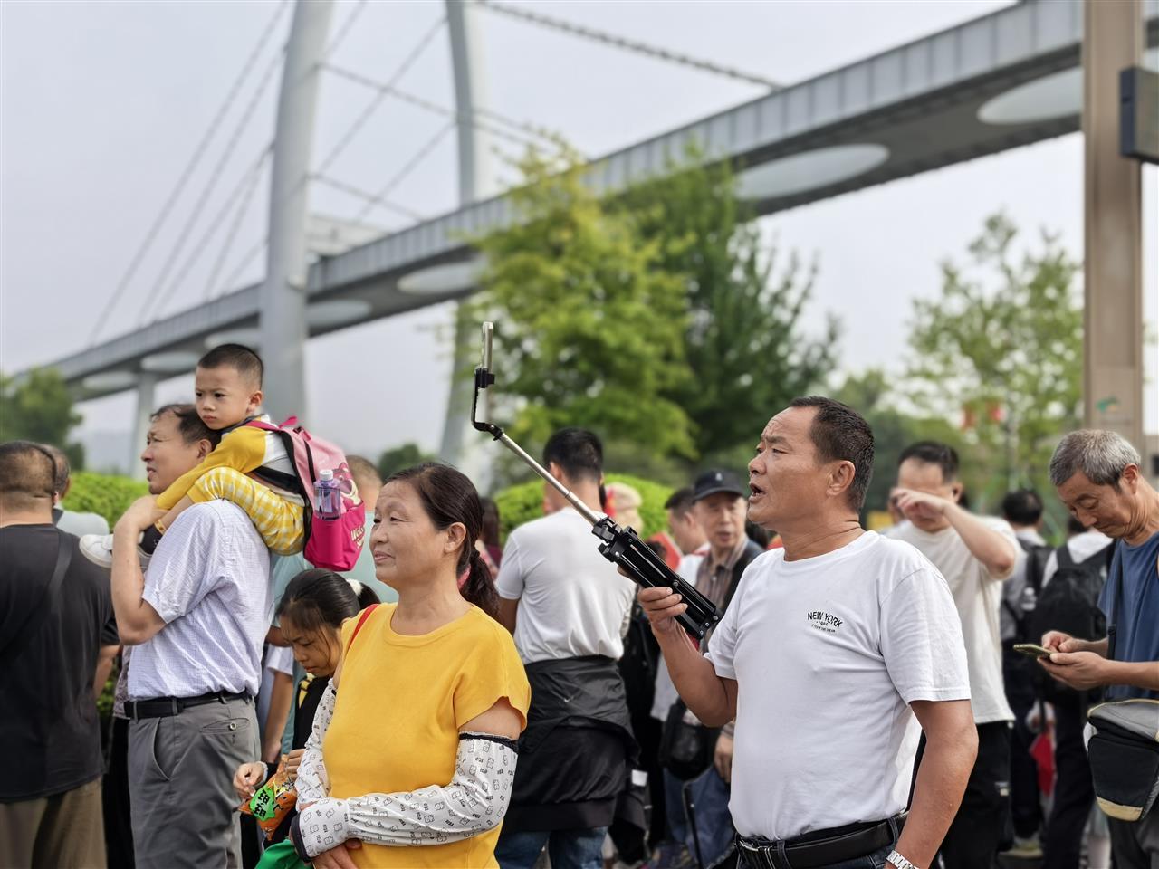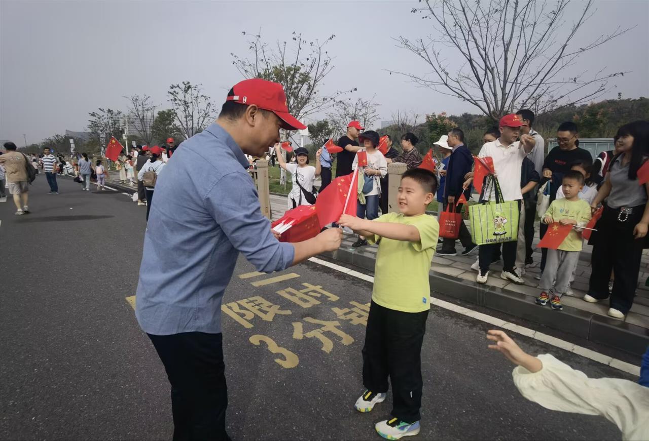 “可以往光谷三路方向再多走一段路,那边人少一些。”10月1日9时不到,光谷花车巡游现场,武汉光谷花山街居民曹跃刚身着红马甲,在高新大道光谷四路路口,给从地铁站出来的游客发放手持国旗,引导他们前往人少的地方观看。