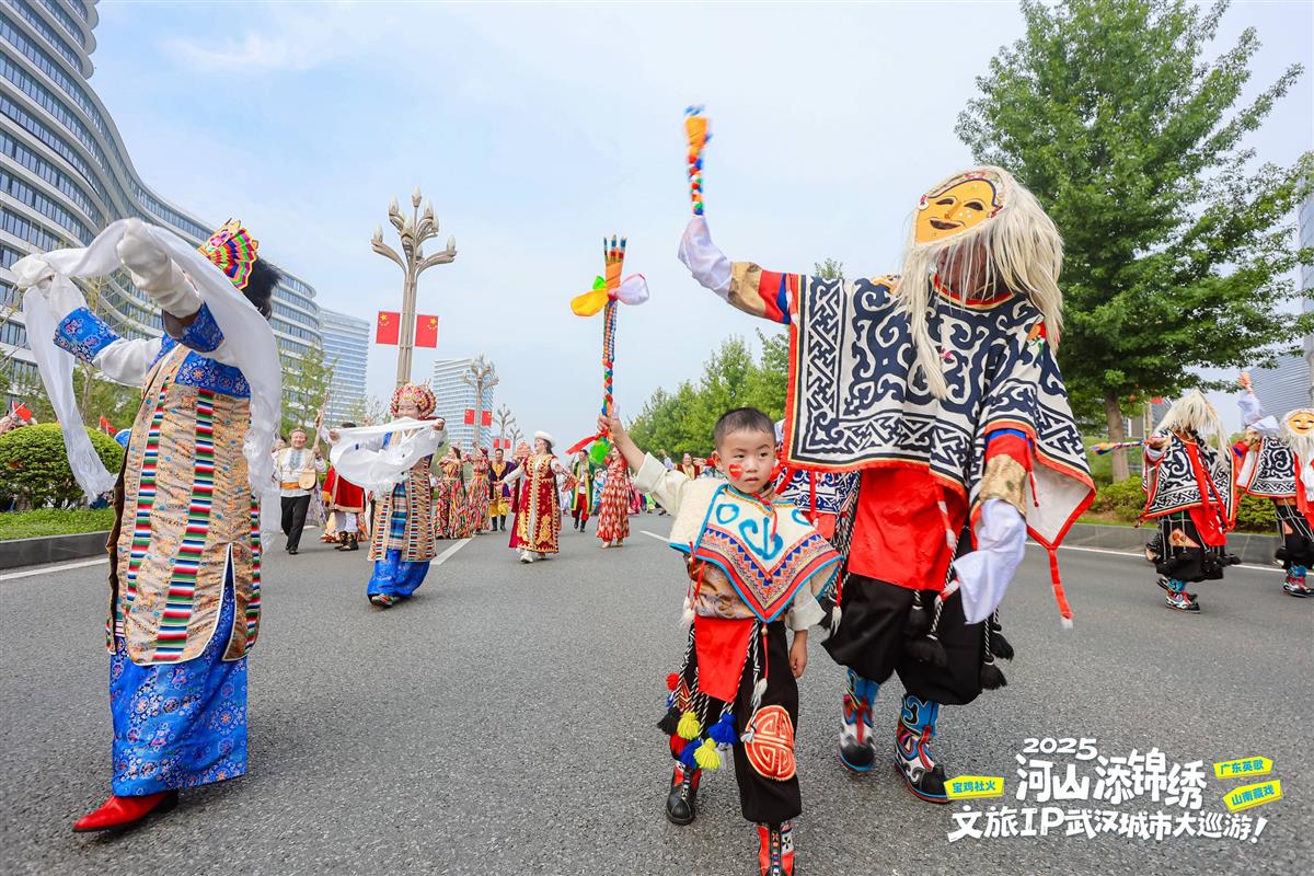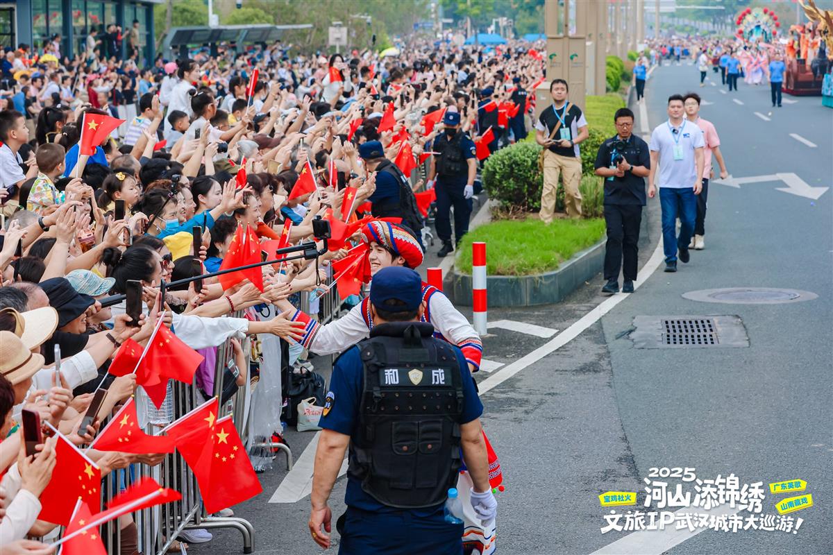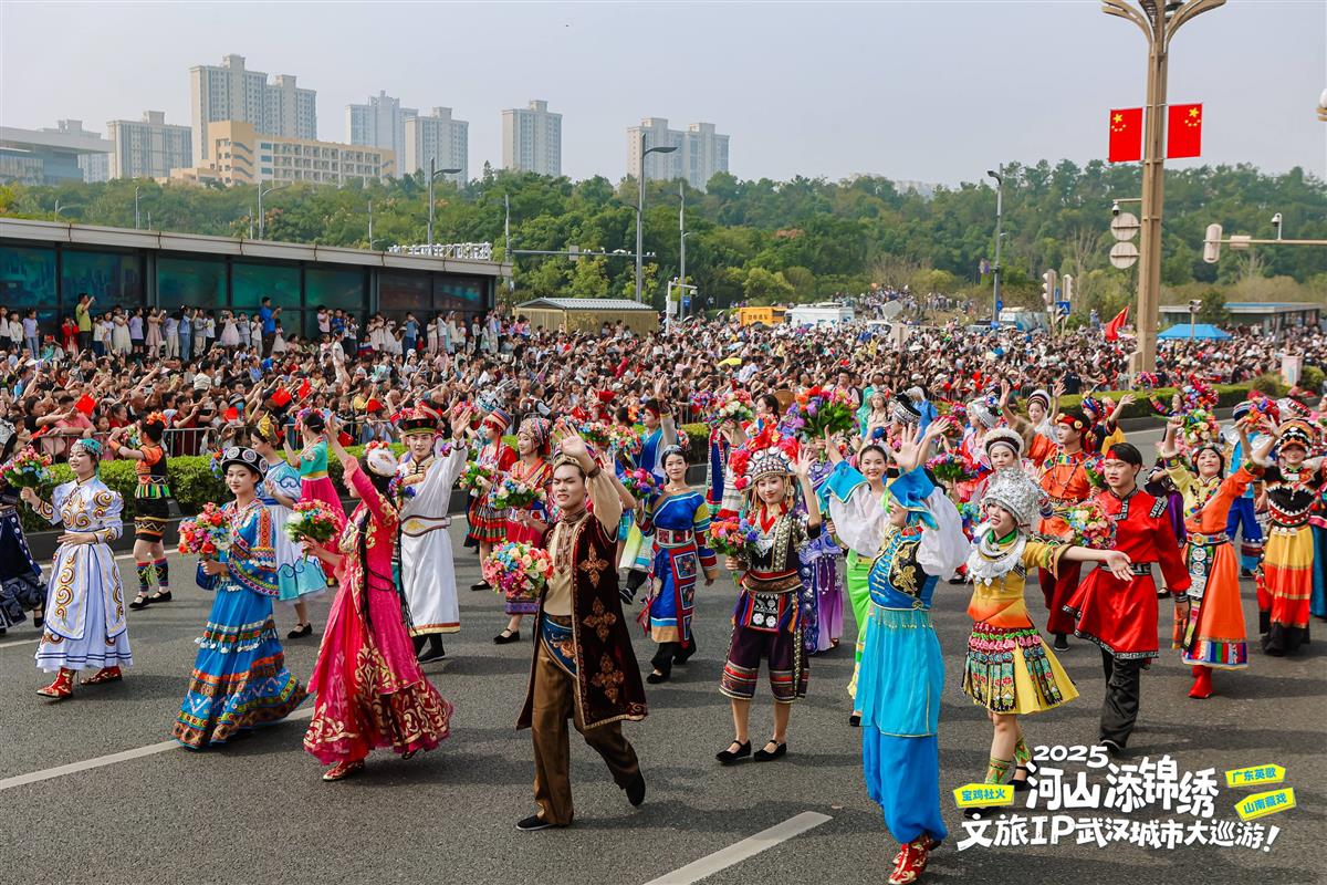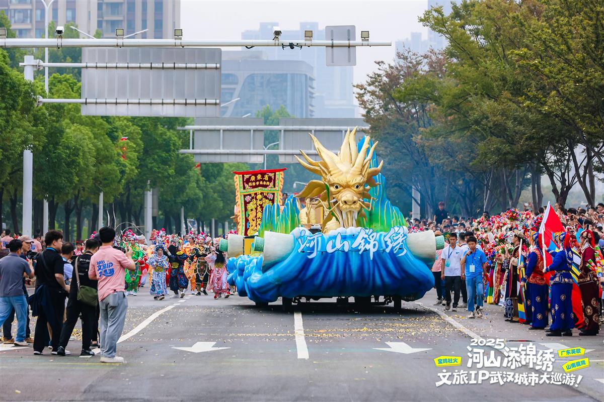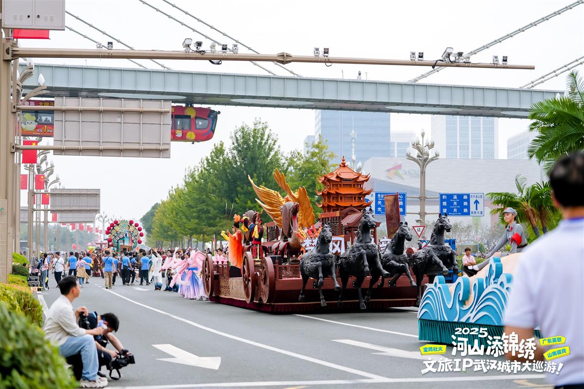 10月1日上午,23台巨型花车方阵一一亮相,国内外38支顶尖演艺团队800余名演员载歌载舞,10万余市民挥舞红旗共同观看了一场融民族精神、荆风楚韵、非遗瑰宝、时代潮流于一体的“河山添锦绣——文旅IP武汉城市大巡游”活动,燃动一座城。