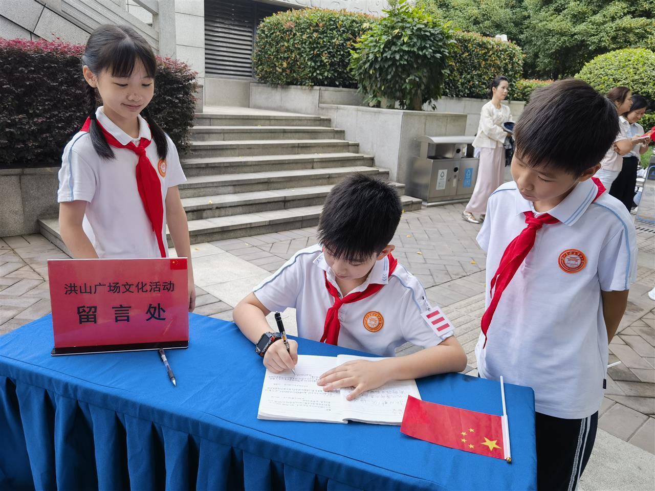 毛梓宸同学(中)在洪山广场留言处写下自己的感言