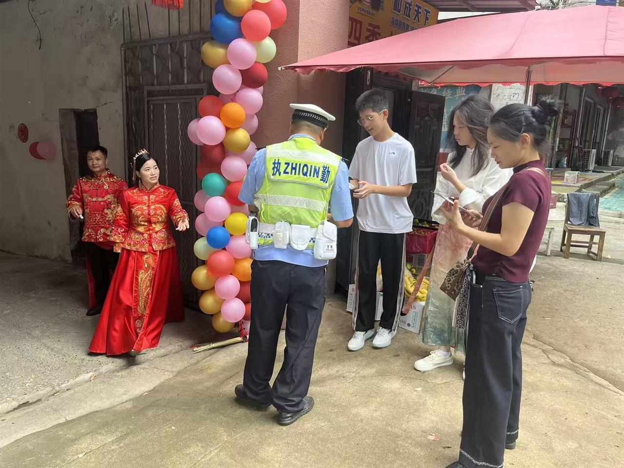 除了路面一线保障外,交通安全宣传亦同步发力。三中队民辅警走进婚宴现场,结合国庆假期亲友聚会增多、秋收农忙时节农机车出行频繁的特点,民警以“身边事”警示“身边人”,通过讲述本地近期发生的酒驾、农用车载人等典型案例,引得在场群众频频点头。民警着重强调“无论是驾驶摩托车还是电动自行车,无论是前排还是后排乘客,都要系好安全带、戴好安全头盔”。