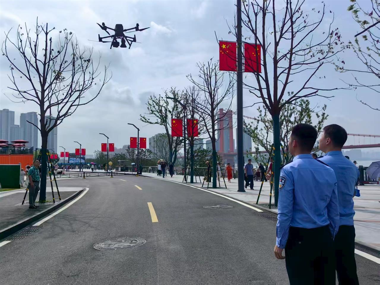 国庆佳节的武昌,一面面五星红旗在路旁、在楼宇、在人们的手中舒展。巡航在黄鹤楼、武昌湾上空的无人机,穿梭在大街小巷的地面PTU、黄鹤卫士,悄然形成“空地一体”的巡查网络,守护着武汉滨江天街、武汉梦时代广场、楚河汉街里的一场场热闹活动。